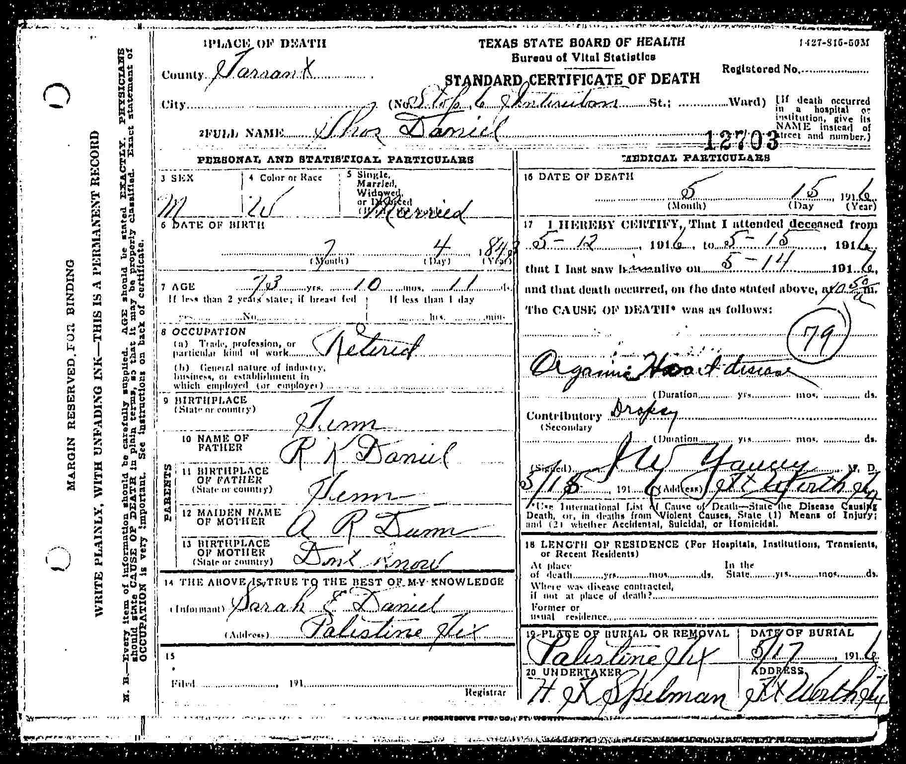 was found Thos. Daniel who died 15 May 1916 at Tarrant County, Texas. He was born 4 July 1843 in Tennessee. He was married but