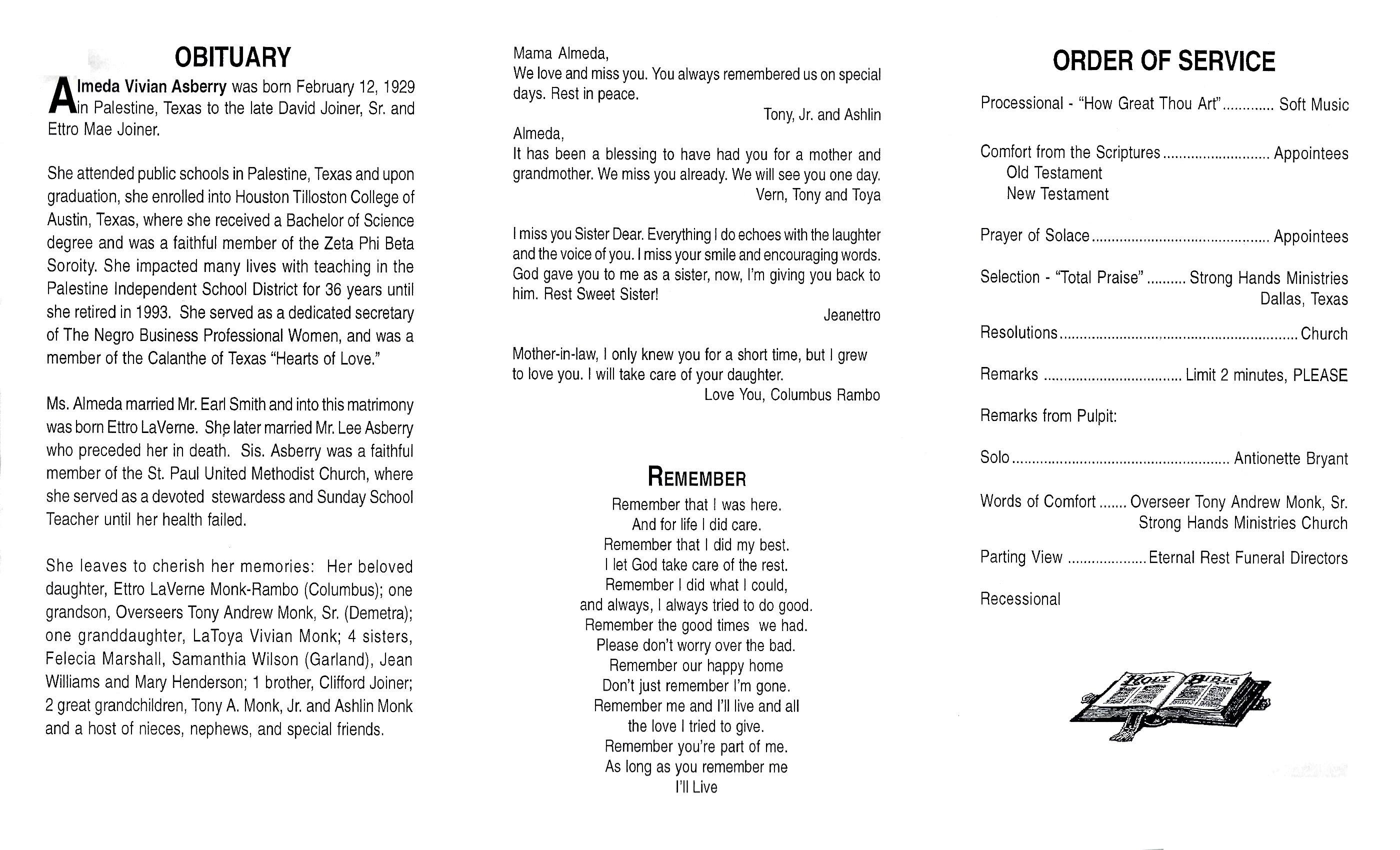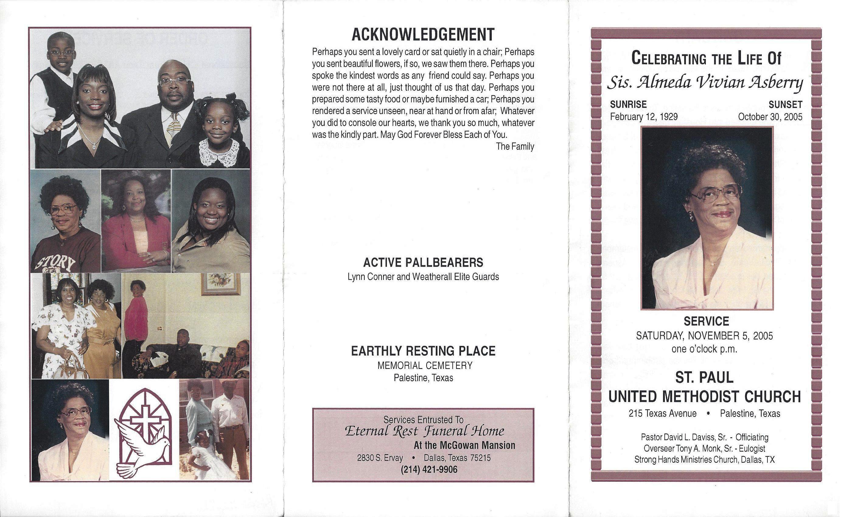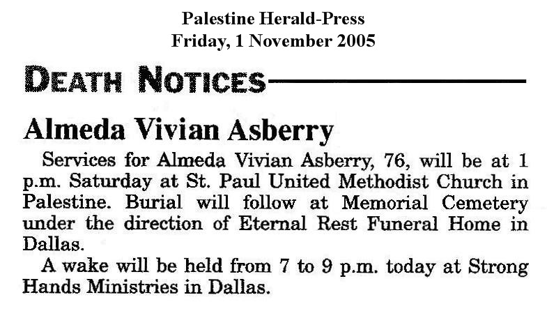 Services for Almeda Vivian Asberry, 76, will be at 1 p.m. Saturday at St. Paul Methodist Church in Palestine. Burial will follow at Memorial Cemetery under the direction of Eternal Rest Funeral Home in Dallas.