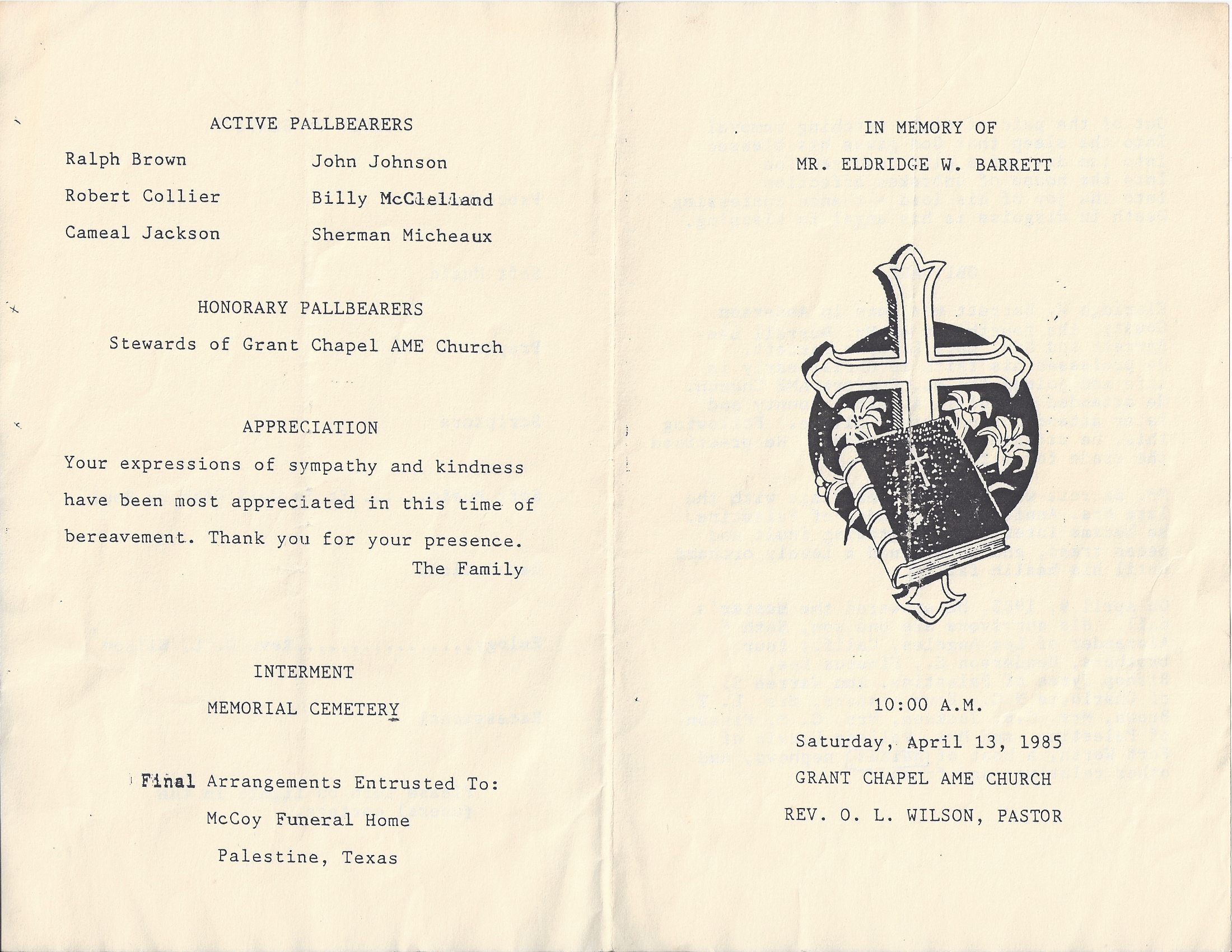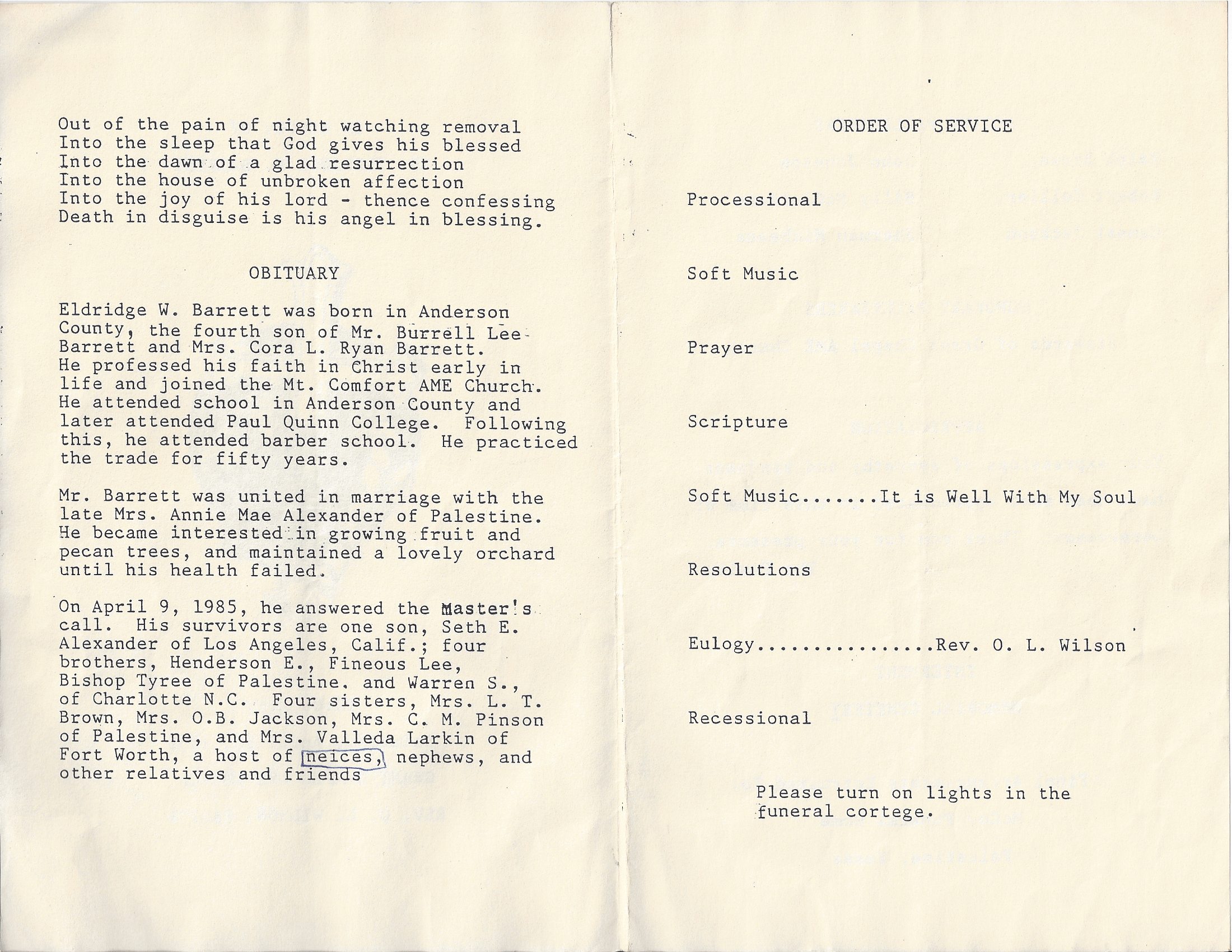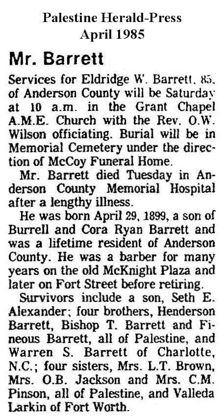 Mr. Barrett Services for Eldridge W. Barrett, 85, of Anderson County will be Saturday at 10 a.m. in the Grant Chapel A.M.E. Church with the Rev. O. W. Wilson officiating. Burial will be in Memorial Cemetery under the direction of McCoy Funeral Home. Mr. Barrett died Tuesday in Anderson County Memorial Hospital after a lengthy illness. He was born April 29, 1899, a son of Burrell and Cora Ryan Barrett and was a lifetime resident of Anderson County. He was a barber for many years on the old McKnight Plaza and later of Fort Street before retiring. Survivors include a son, Seth E. Alexander; four brothers, Henderson Barrett, Bishop T. Barrett and Fineous Barrett, all of Palestine, and Warren S. Barrett of Charlotte, N.C.; four sisters, Mrs. L. T. Brown, Mrs. O. B. Jackson and Mrs. C. M. Pinson, all of Palestine, and Valleda Larkin of Fort Worth. |