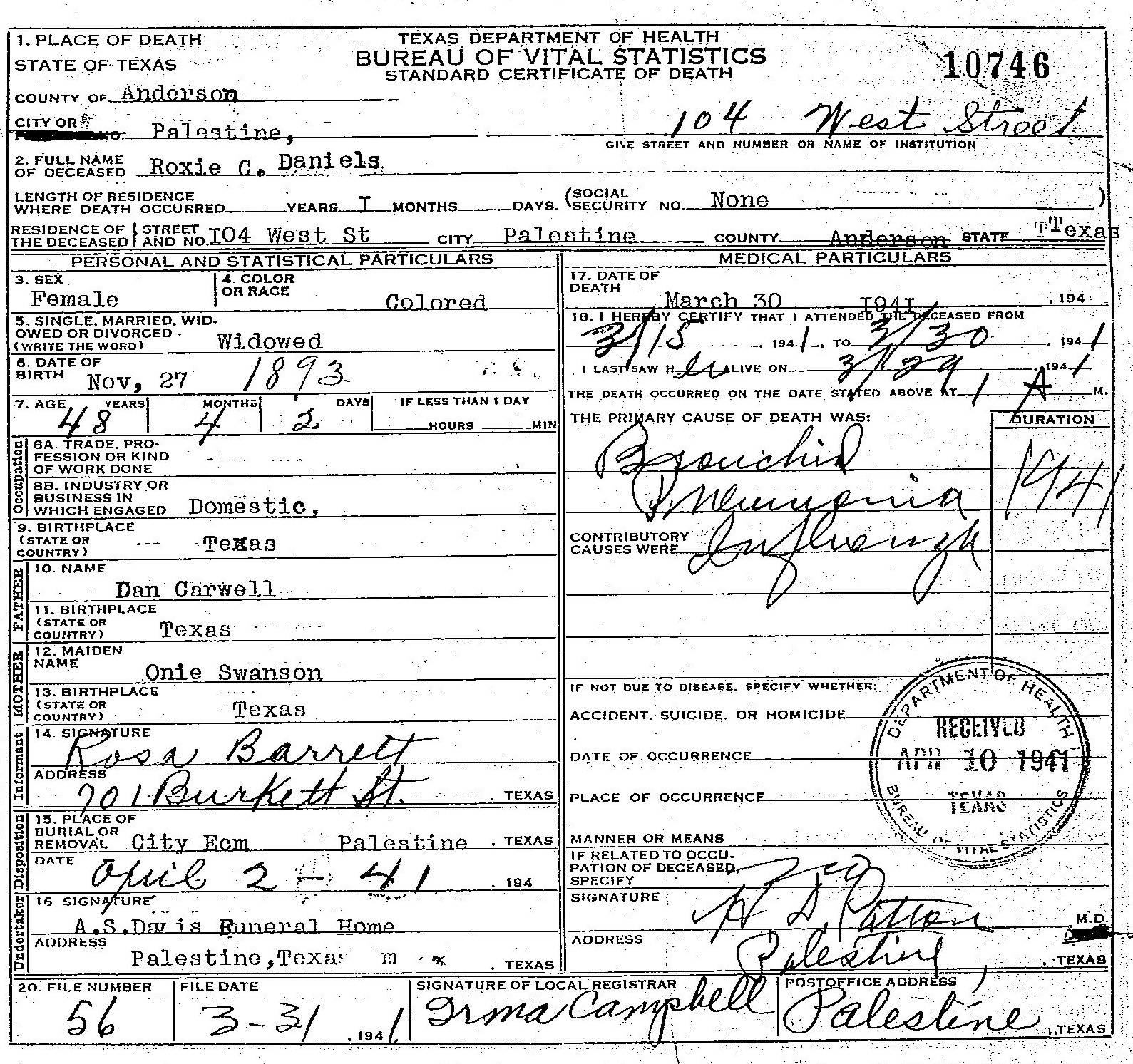 Born: November 27 1881 - Texas