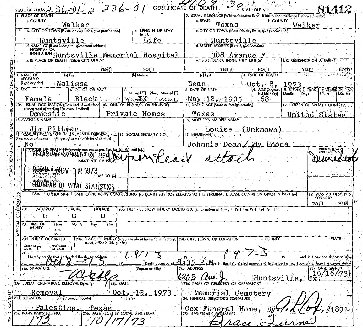 Died:  October 8 1973 - Huntsville, Walker, Texas
