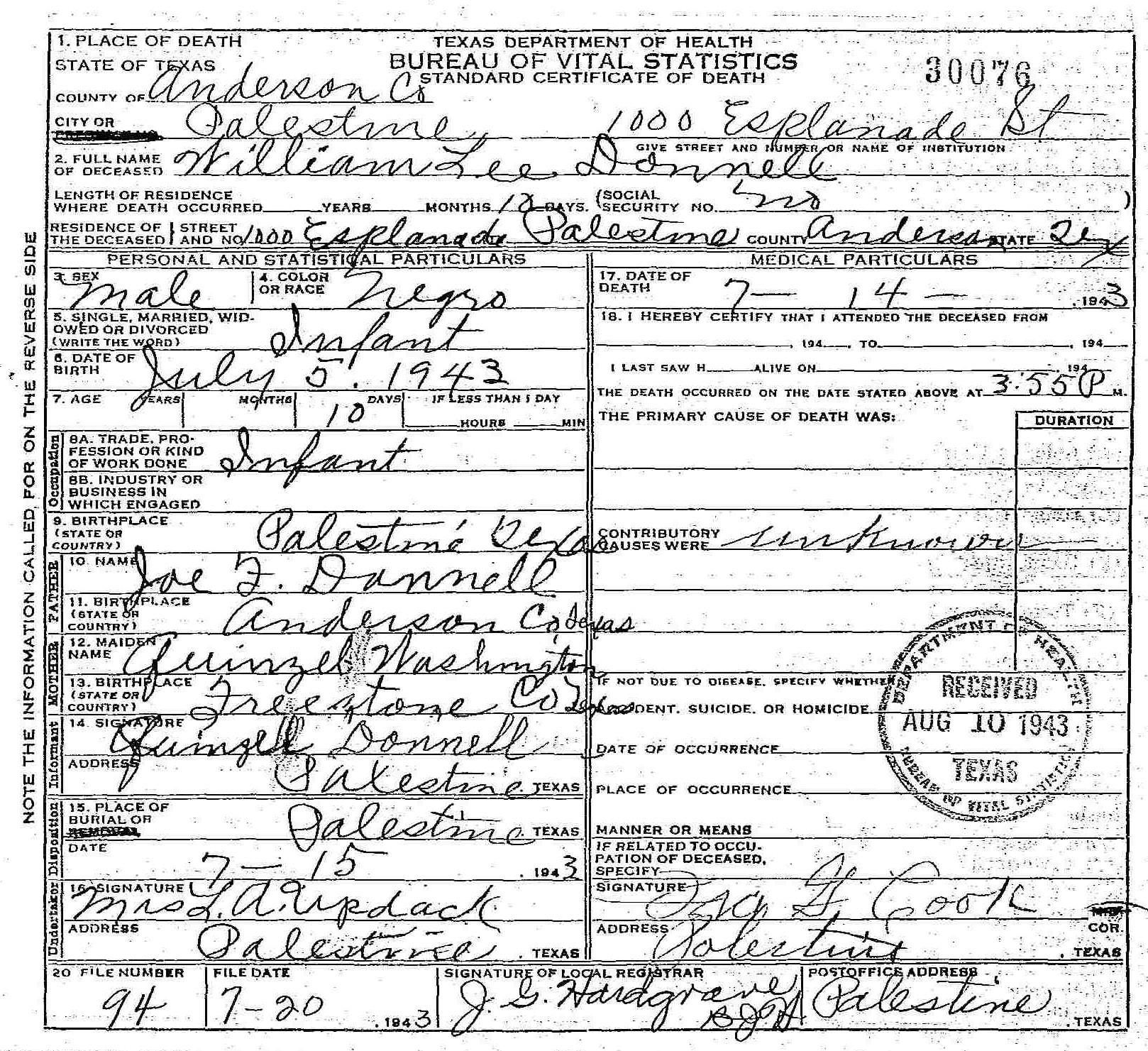 Born: July 5 1943 - Palestine, Anderson,