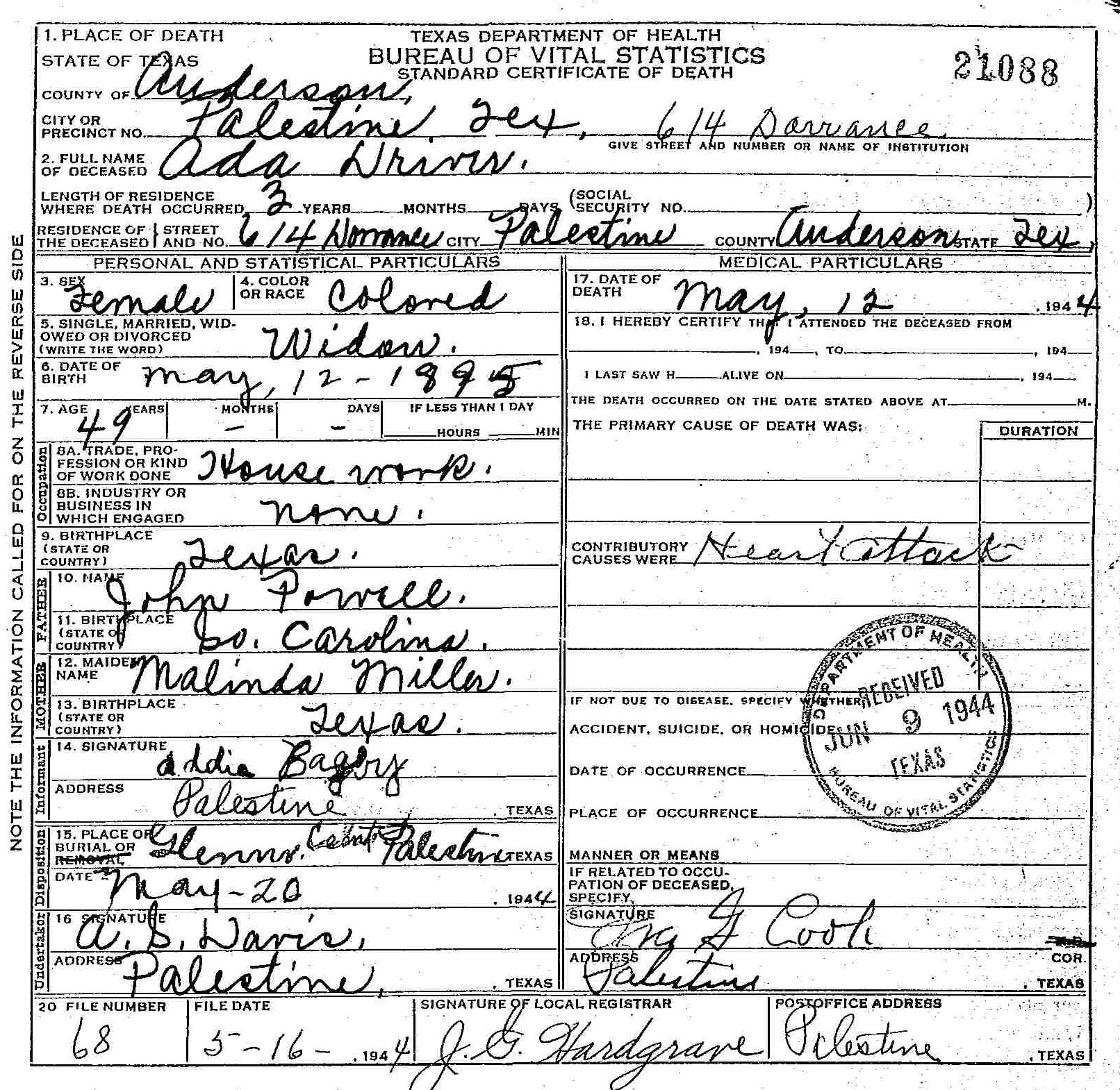 Died:  May 12 1944 - Palestine, Anderson, Texas