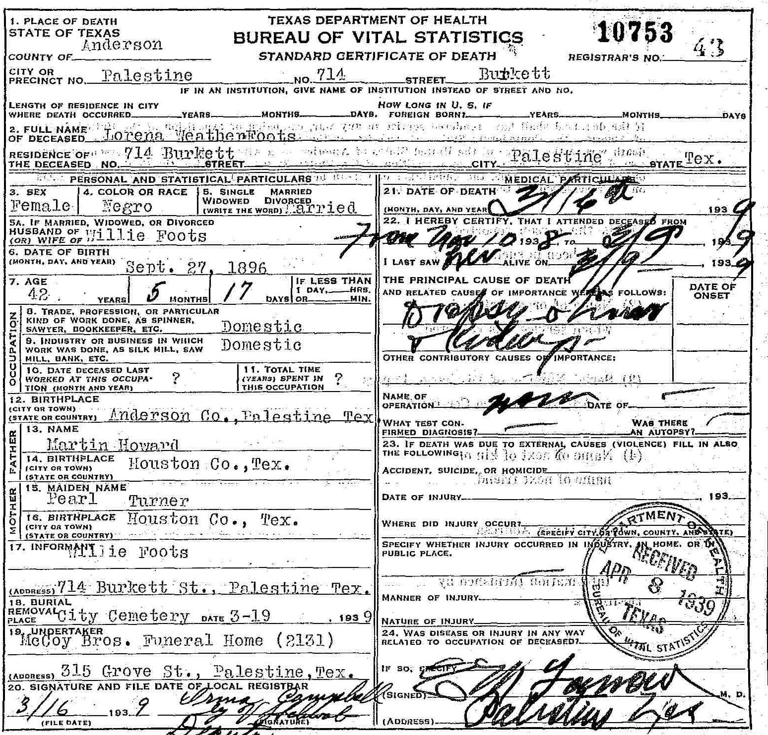 Died:  March 6 1939 - Palestine, Anderson, Texas