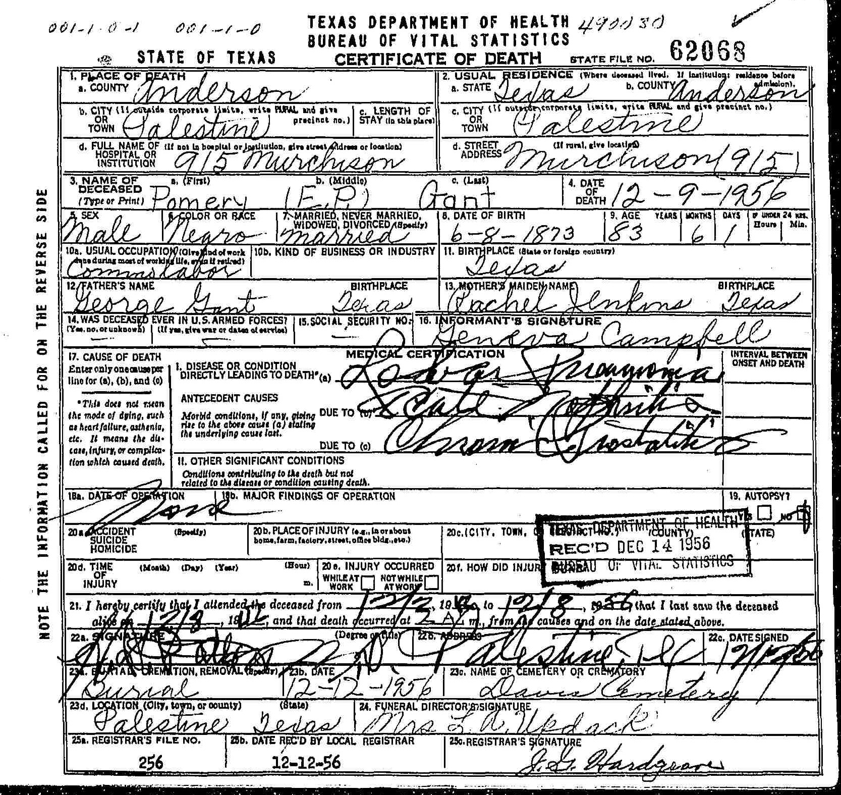 Died:  December 9 1956 - Palestine, Anderson, Texas