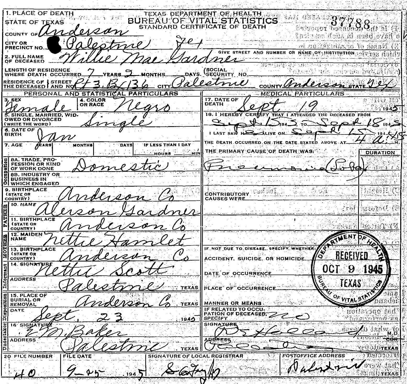 Died:  September 19 1945 - Palestine, Anderson, Texas