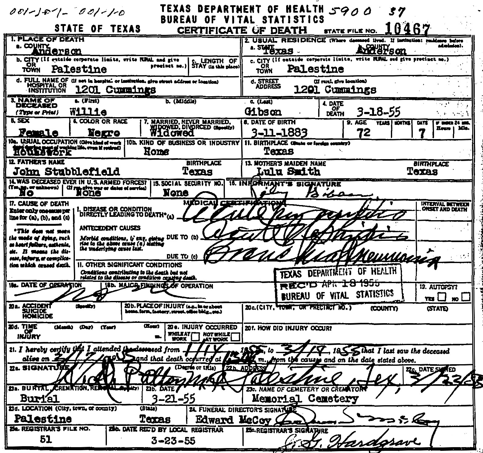 Died:  March 18 1955 - Palestine, Anderson, Texas