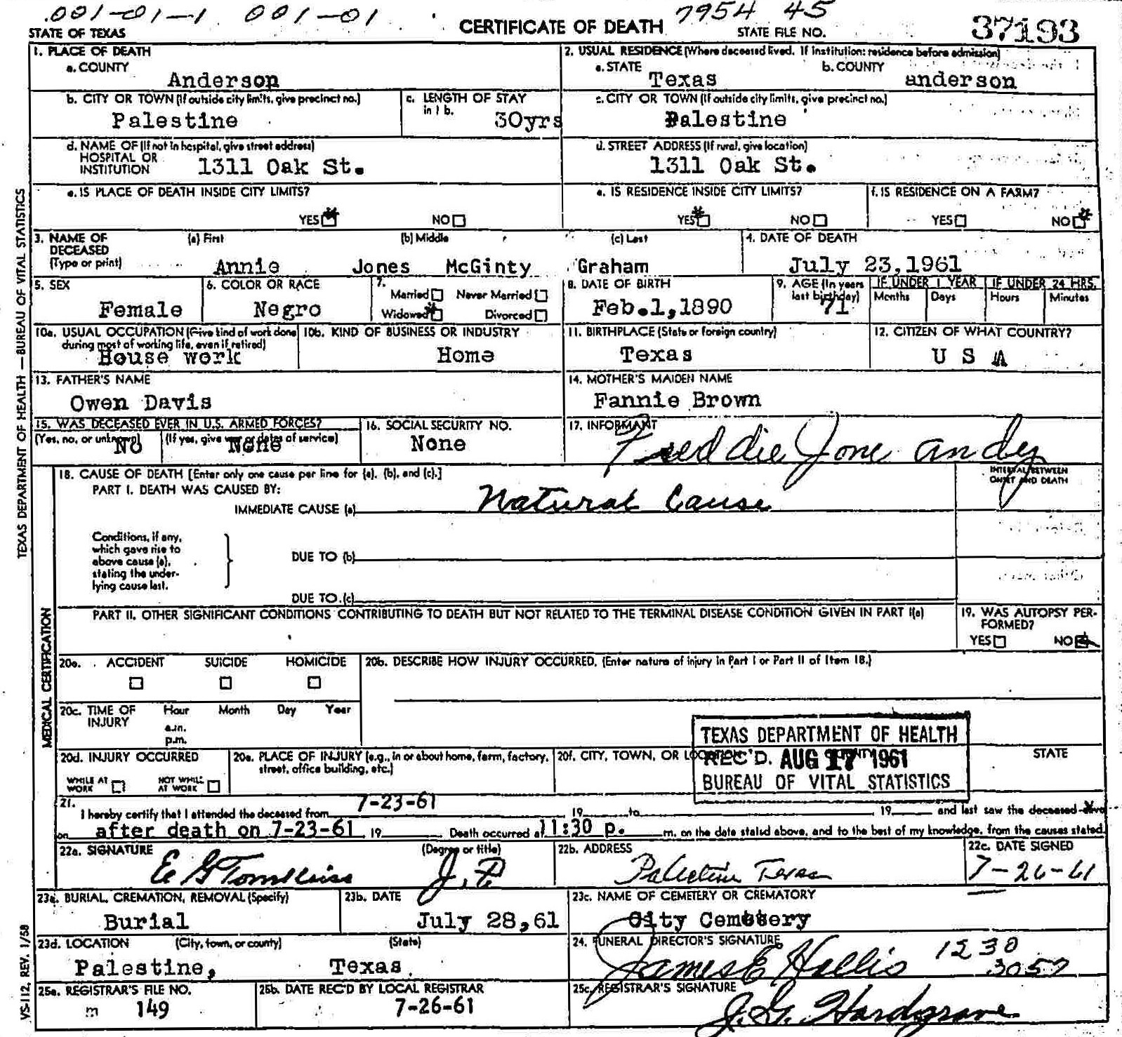 Born: February 1 1890 - Freestone County,