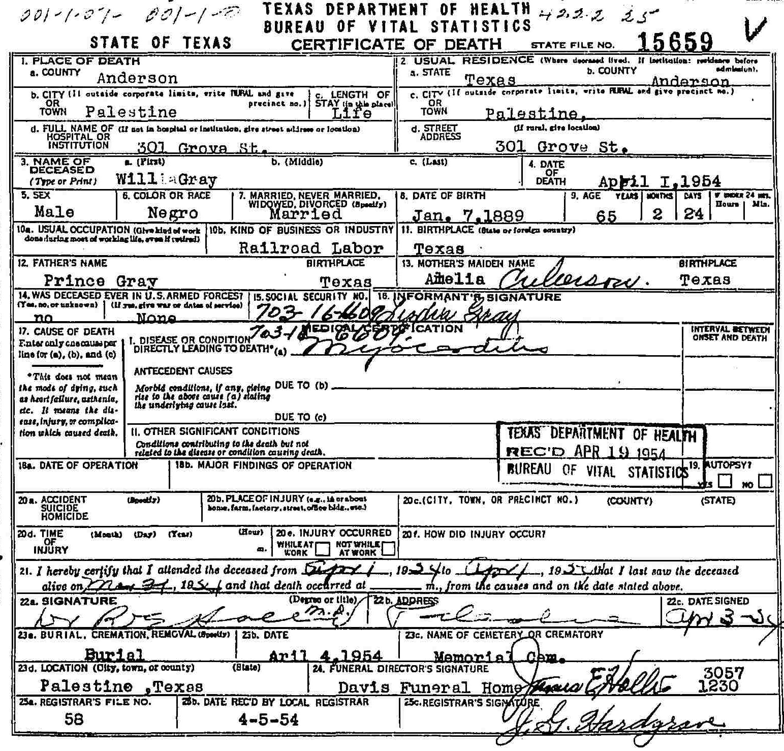 Died:  April 1 1954 - Palestine, Anderson, Texas