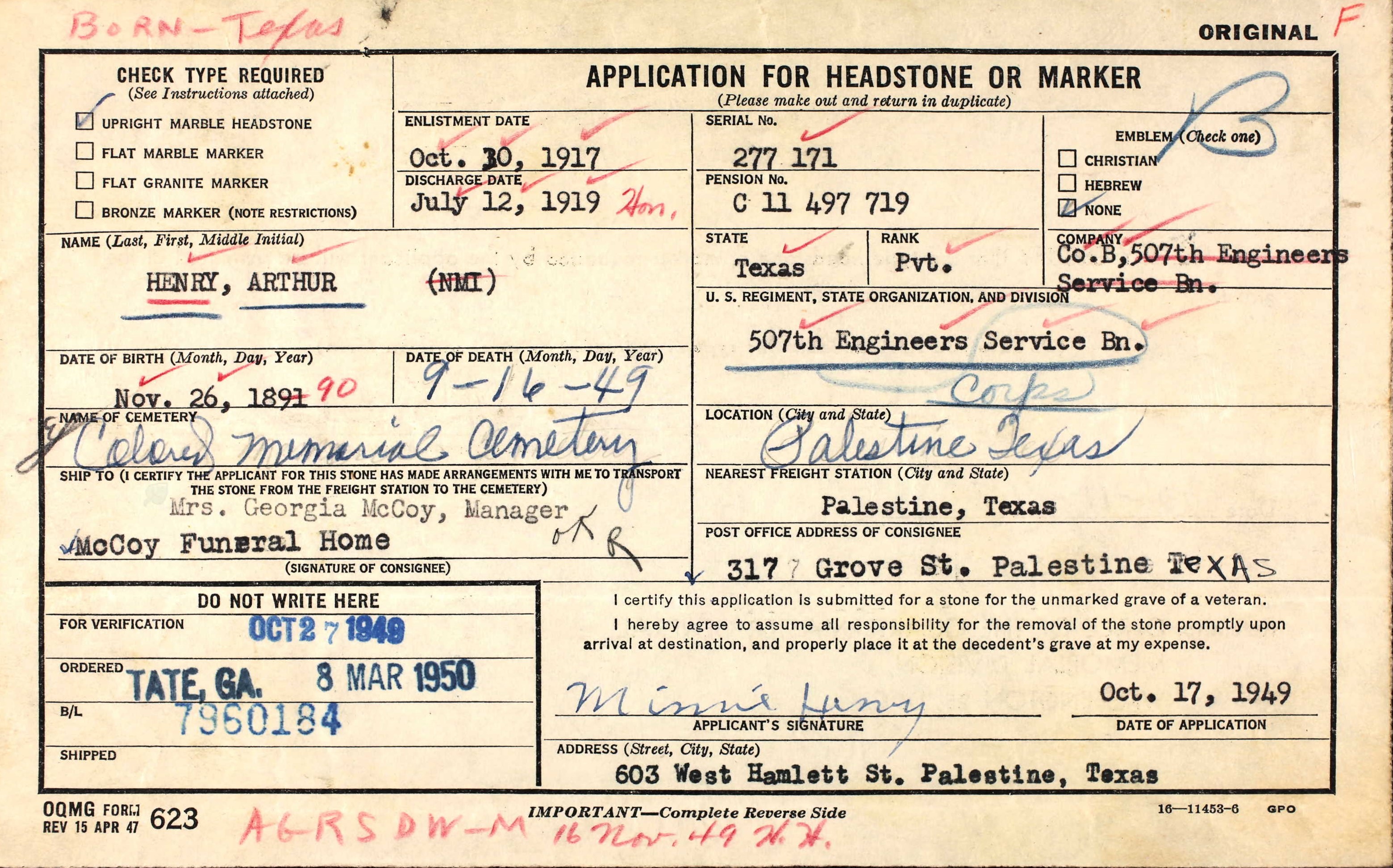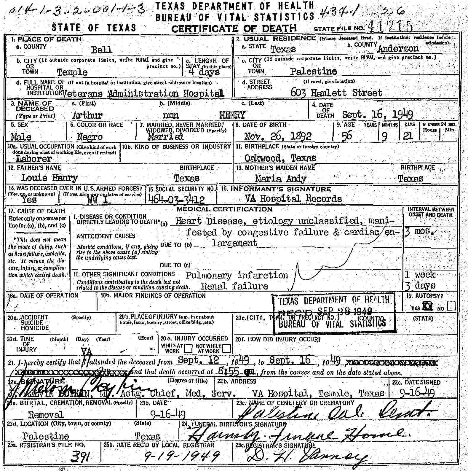 Died:  September 16 1949 - Temple, Bell, Texas