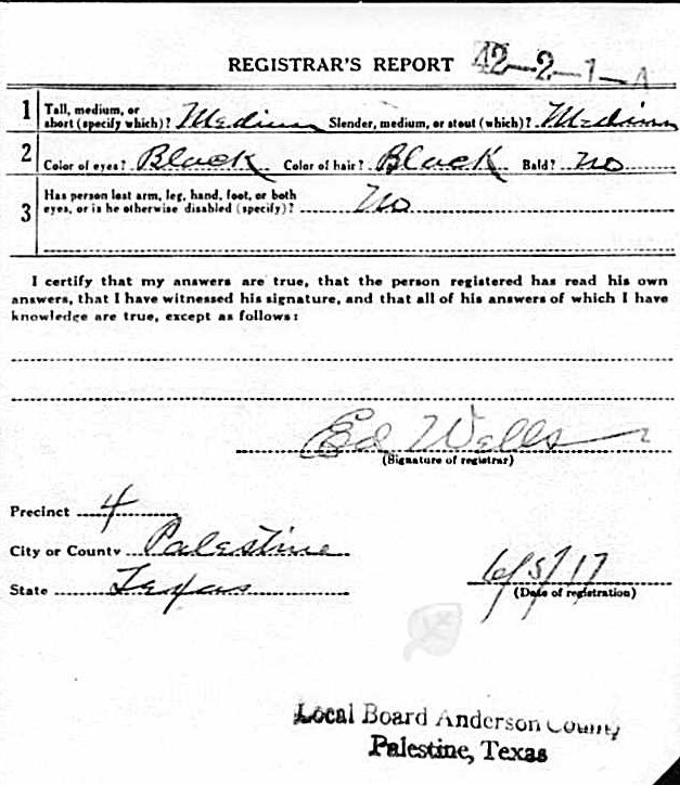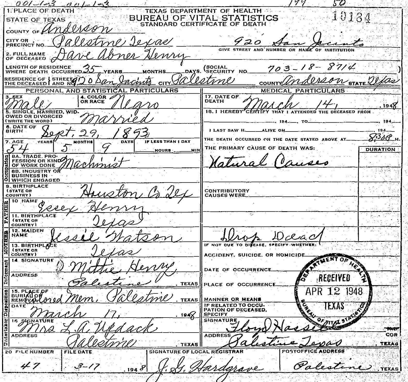 Died:  March 14 1948 - Palestine, Anderson, Texas