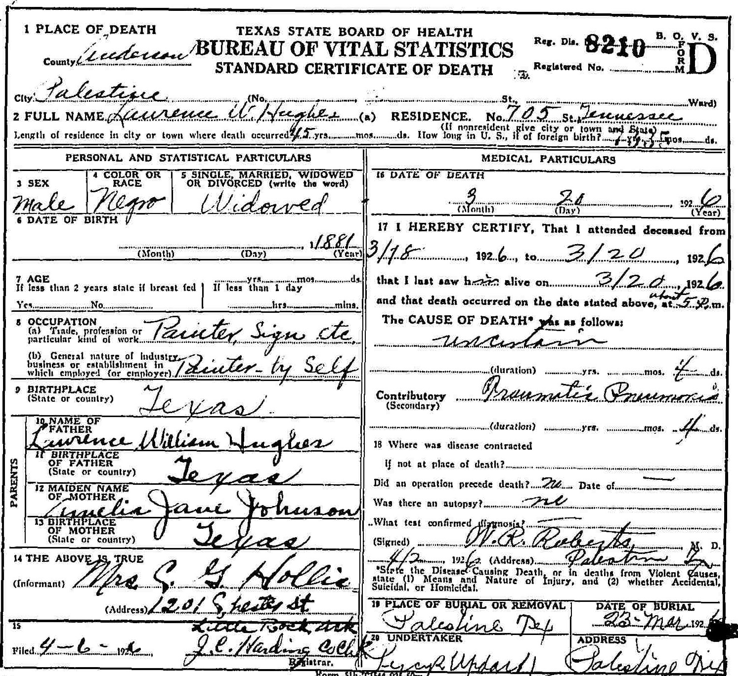 Died:  March 20 1926 - Palestine, Anderson, Texas