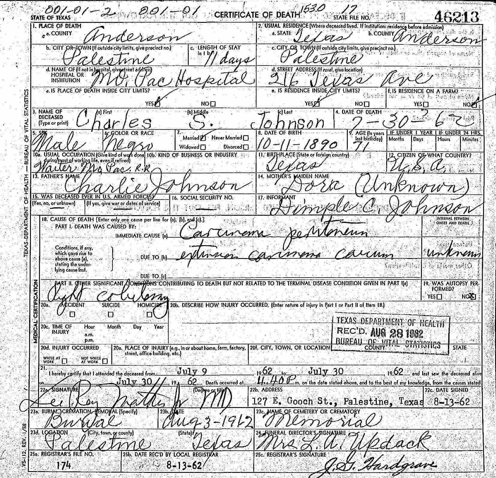 Died:  July 30 1962 - Palestine, Anderson, Texas