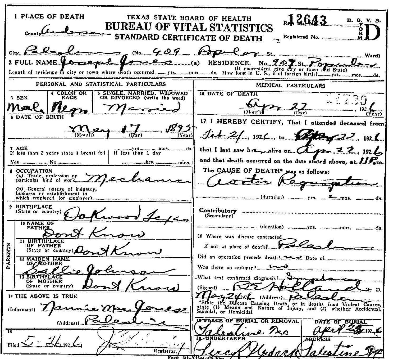 Died:  April 22 1926 - Palestine, Anderson, Texas