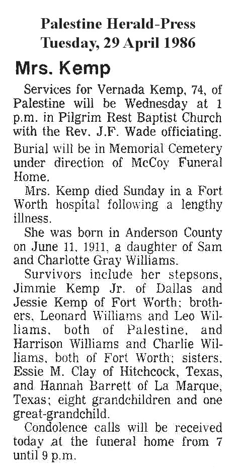 Services for Vernada Kemp, 74, of Palestine will be Wednesday at