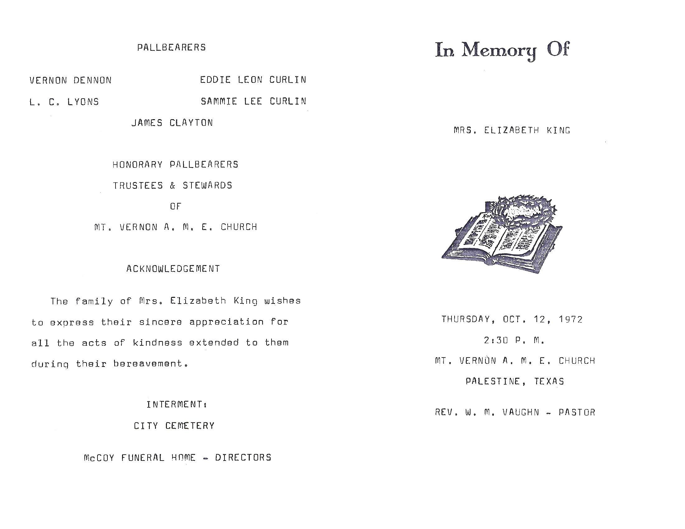 Booker T. King. She joined the Mt. Vernon A.M.E. Church under the