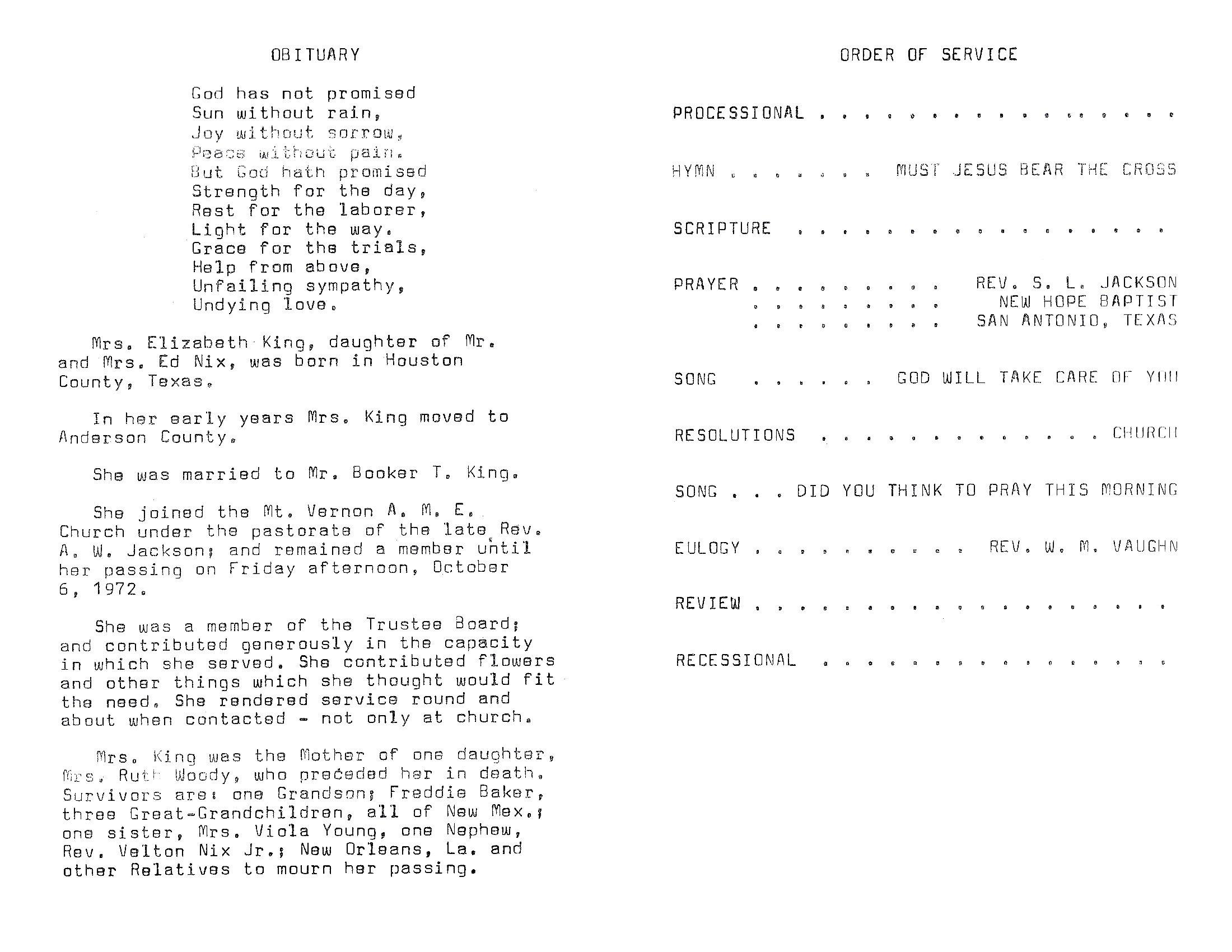 church. Mrs. King was Mother of one daughter, Mrs. Ruth Woody,