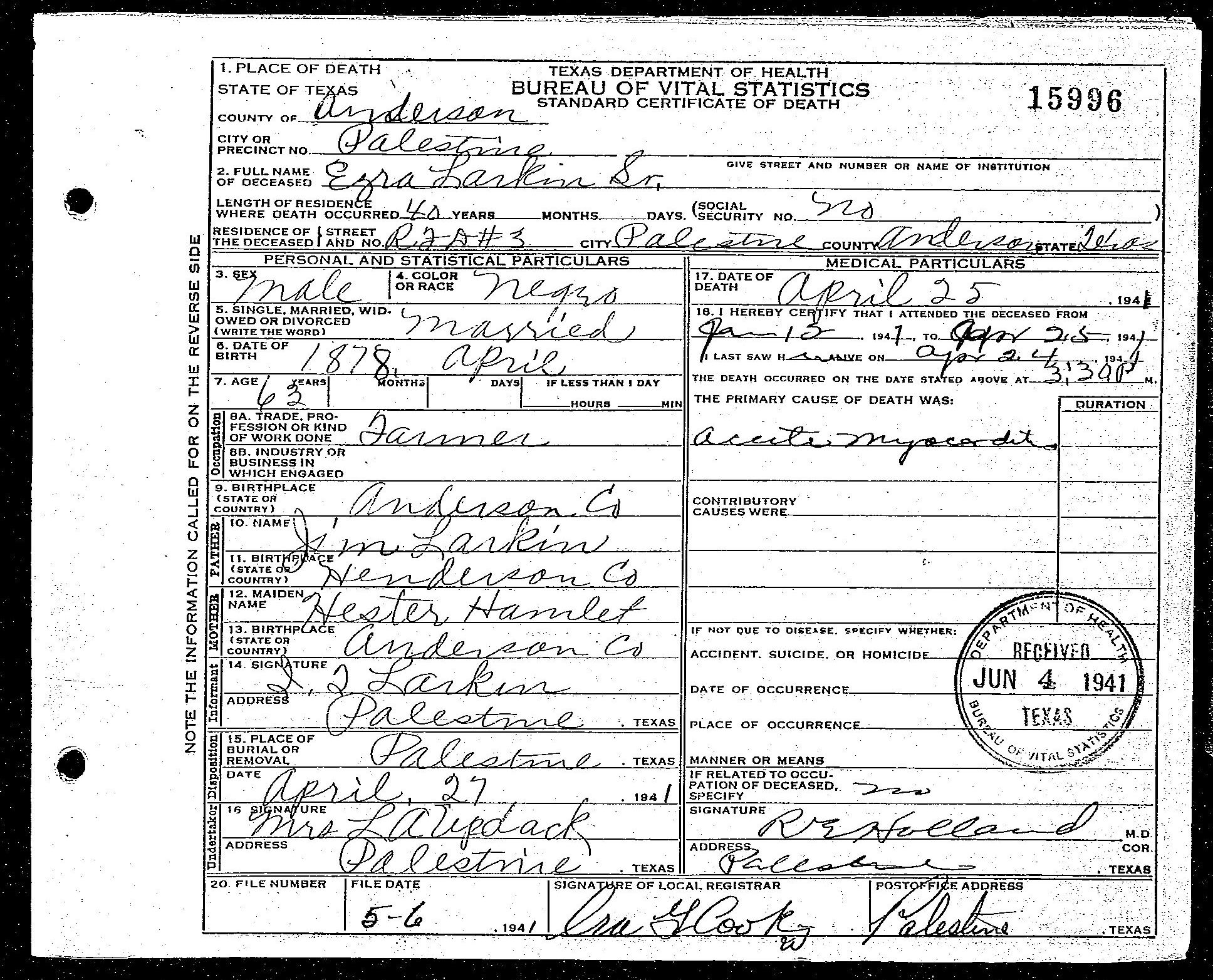 Born: April 1878 - Anderson County, Texas
