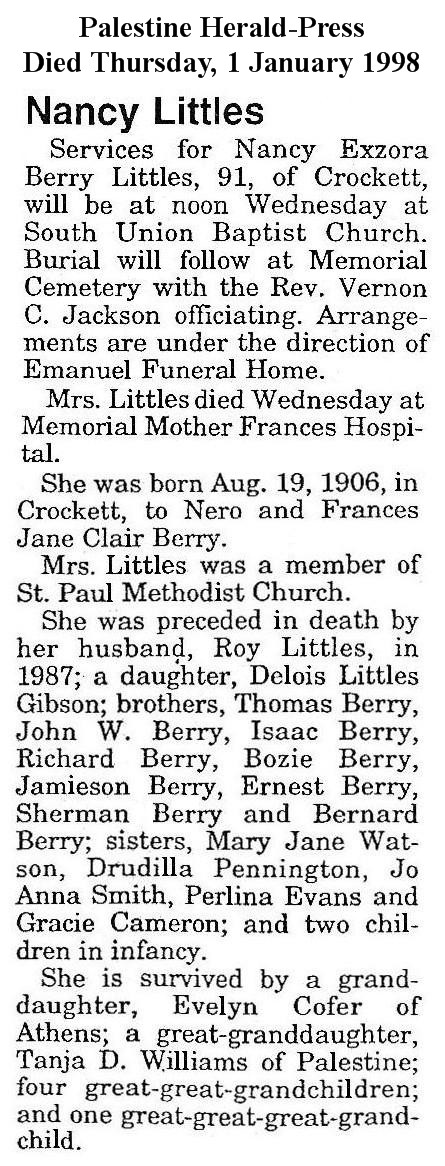 of Emanuel Funeral Home. Mrs. Littles died Wednesday at Memorial Mother Frances Hospital. She was born Aug. 19, 1906 in Crockett, to Nero and Frances Jane Clair Berry. Mrs. Littles was a member of St. Paul Methodist Church. She was preceded in death by her husband, Roy Littles, in 1987; a daughter, Delois Littles Gibson; brothers, Thomas Berry, John W. Berry, Isaac Berry, Richard Berry, Bozie Berry, Jamieson Berry, Ernest Berry, Sherman Berry and Bernard Berry; sisters, Mary Jane Watson, Drudilla Pennington, Jo Anna Smith, Perlina Evans and Gracie Cameron; and two children in infancy. She is survived by a granddaughter, Evelyn Cofer of Athens; a great-granddaughter, Tanja D. Williams of Palestine; four great-great-grandchildren; and one great-great-great-grandchild. |