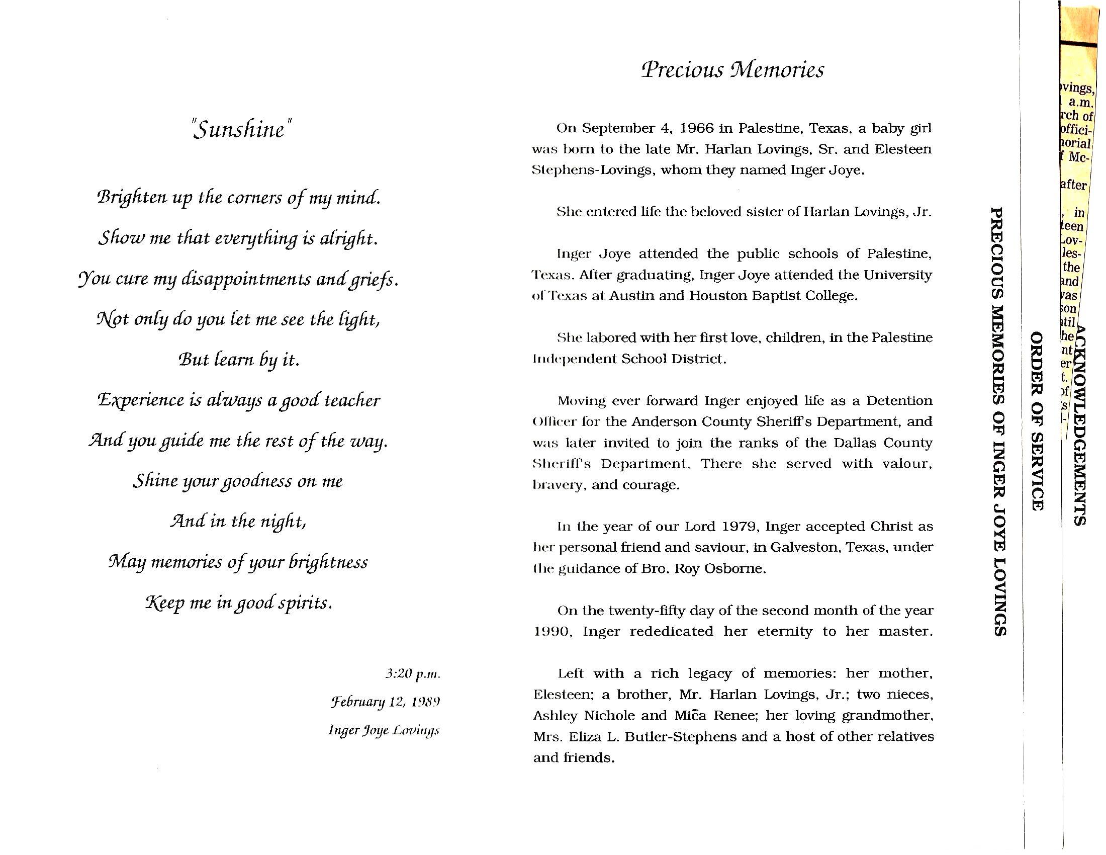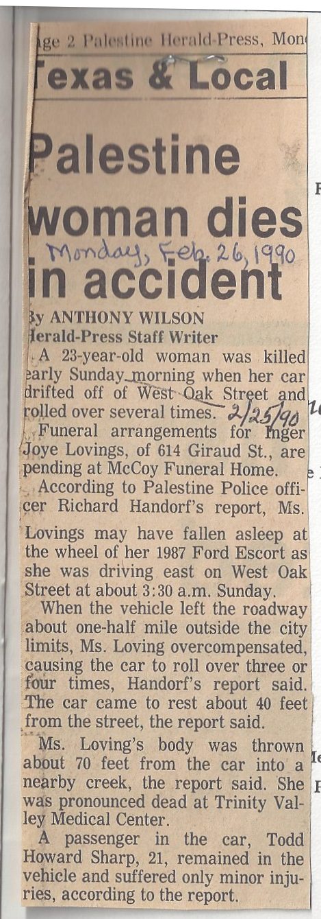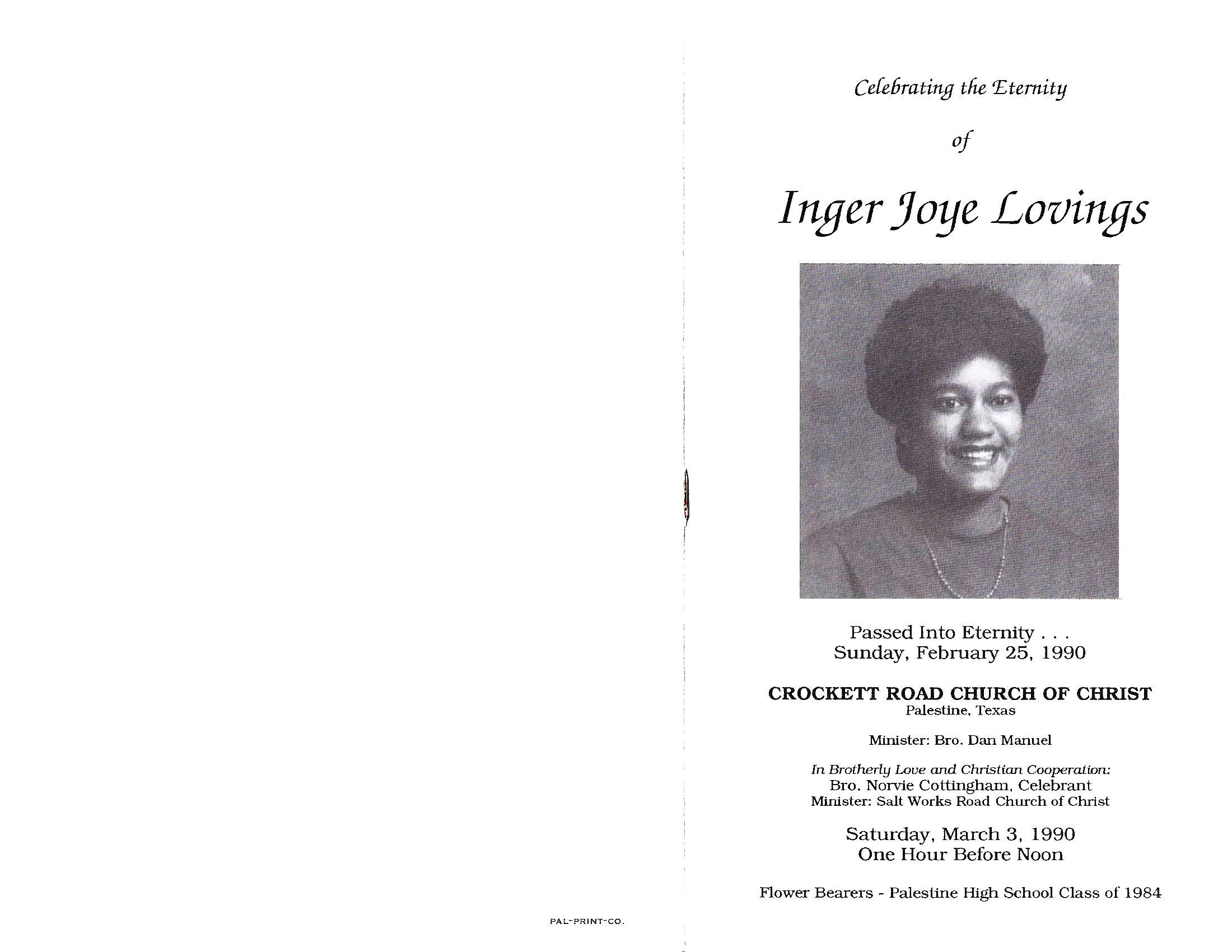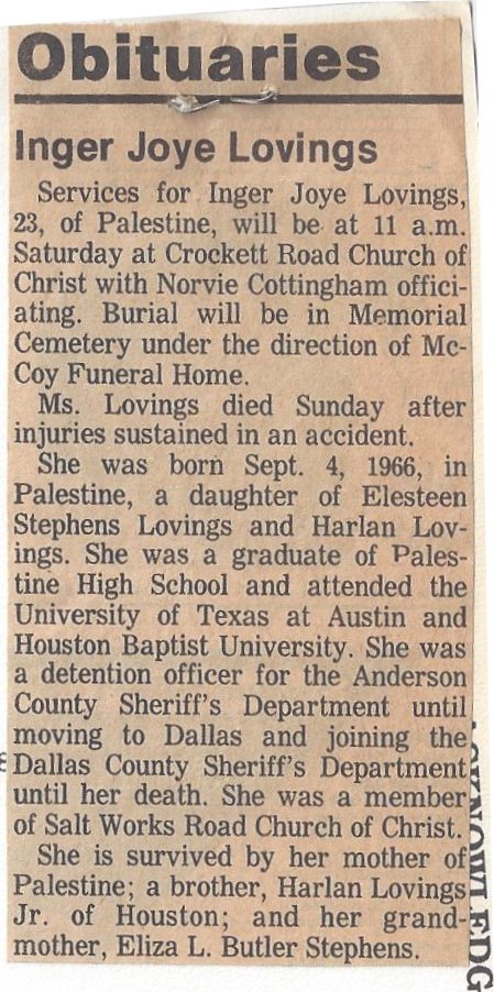 Palestine; a brother, Harlan Lovings Jr. of Houston; and her