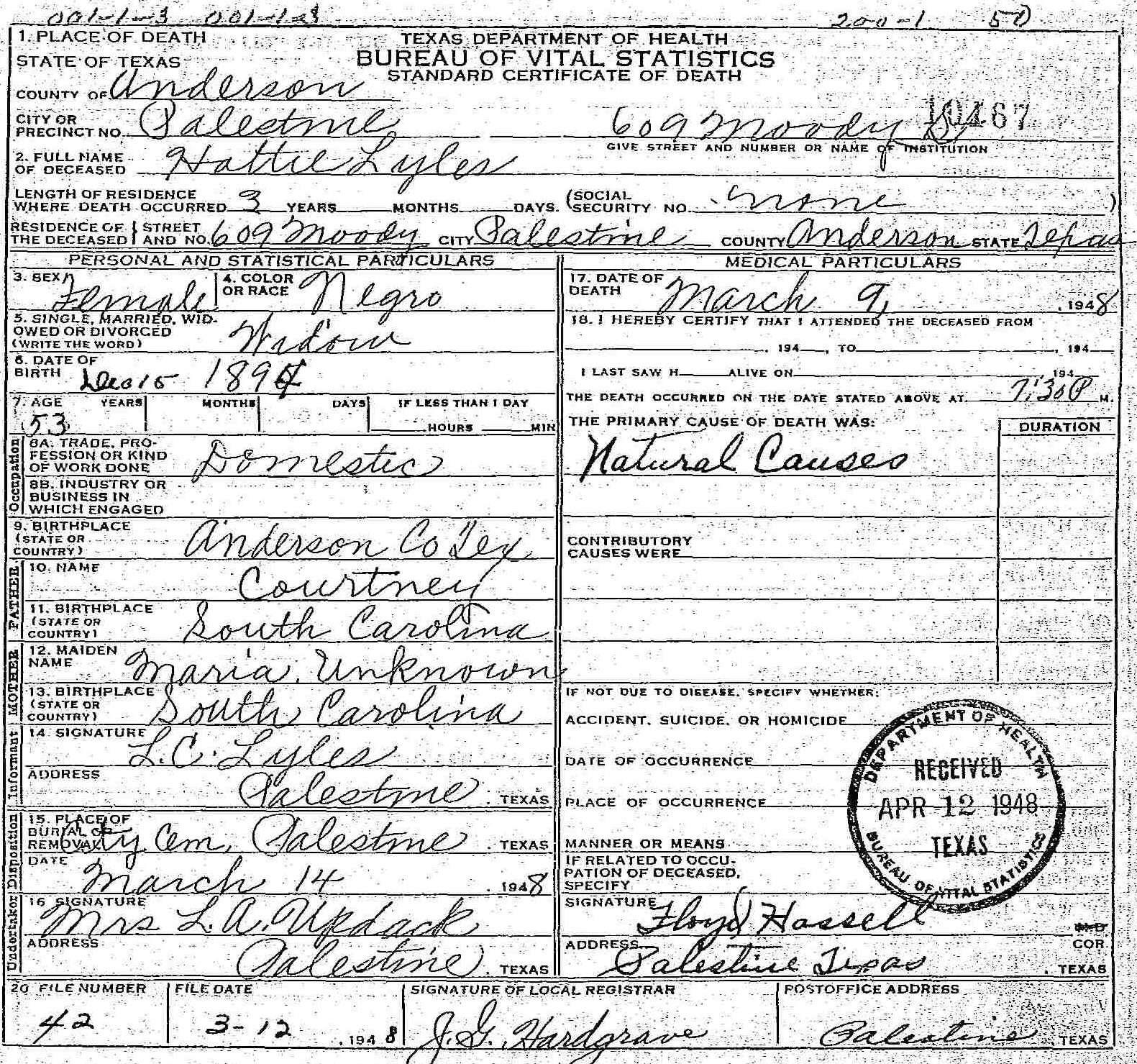 Born: 15 December 1894 - Anderson County,