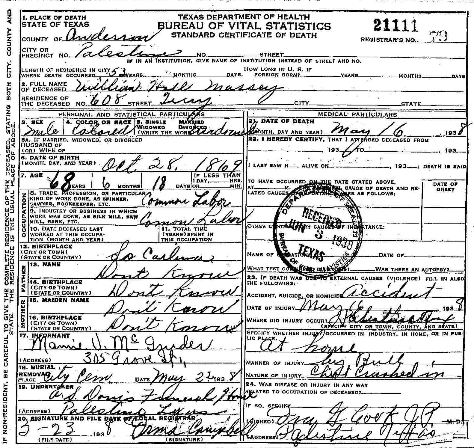 Born: 28 October 1869 - South Carolina