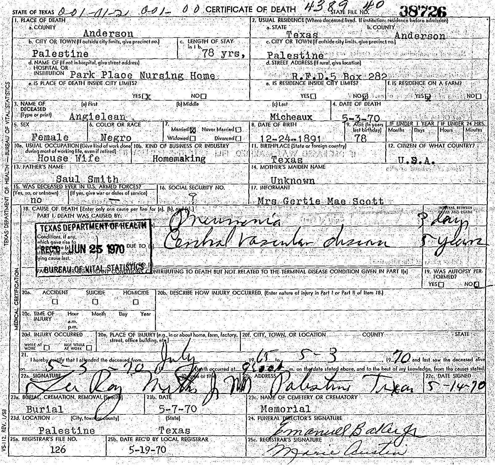 Died:  3 May 1970 - Palestine, Anderson, Texas