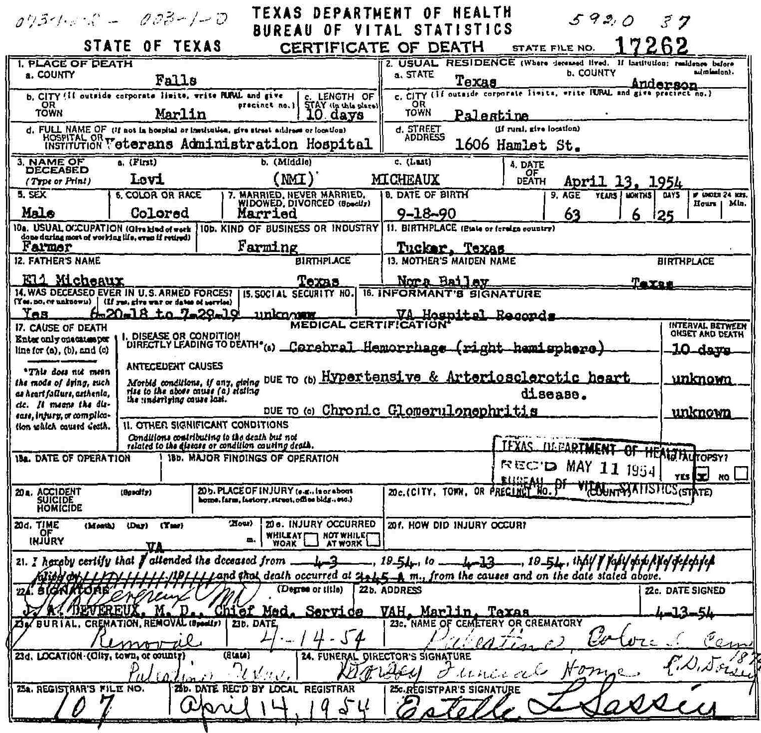 Died:  13 April 1954 - Marlin, Falls, Texas