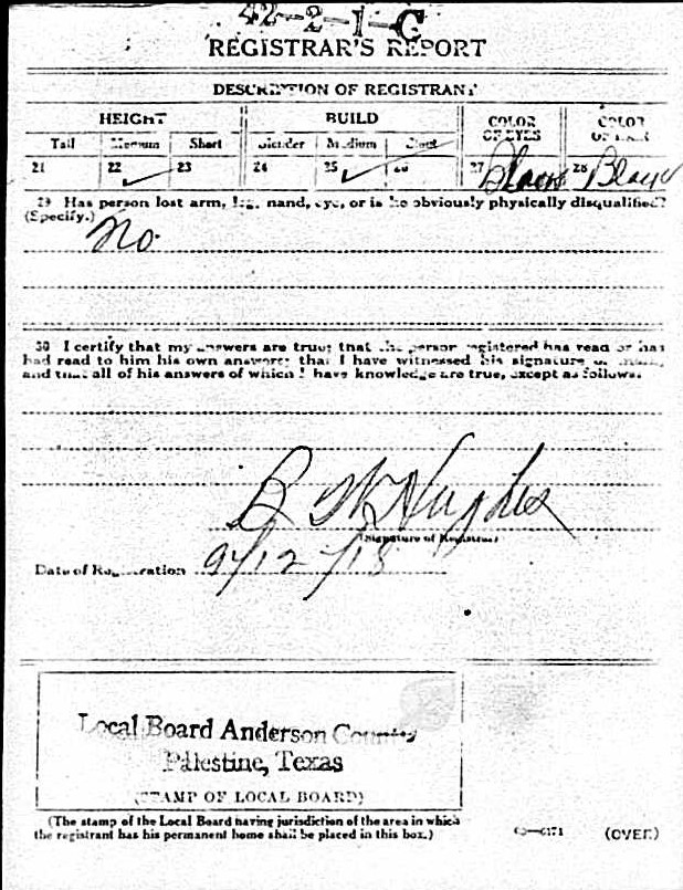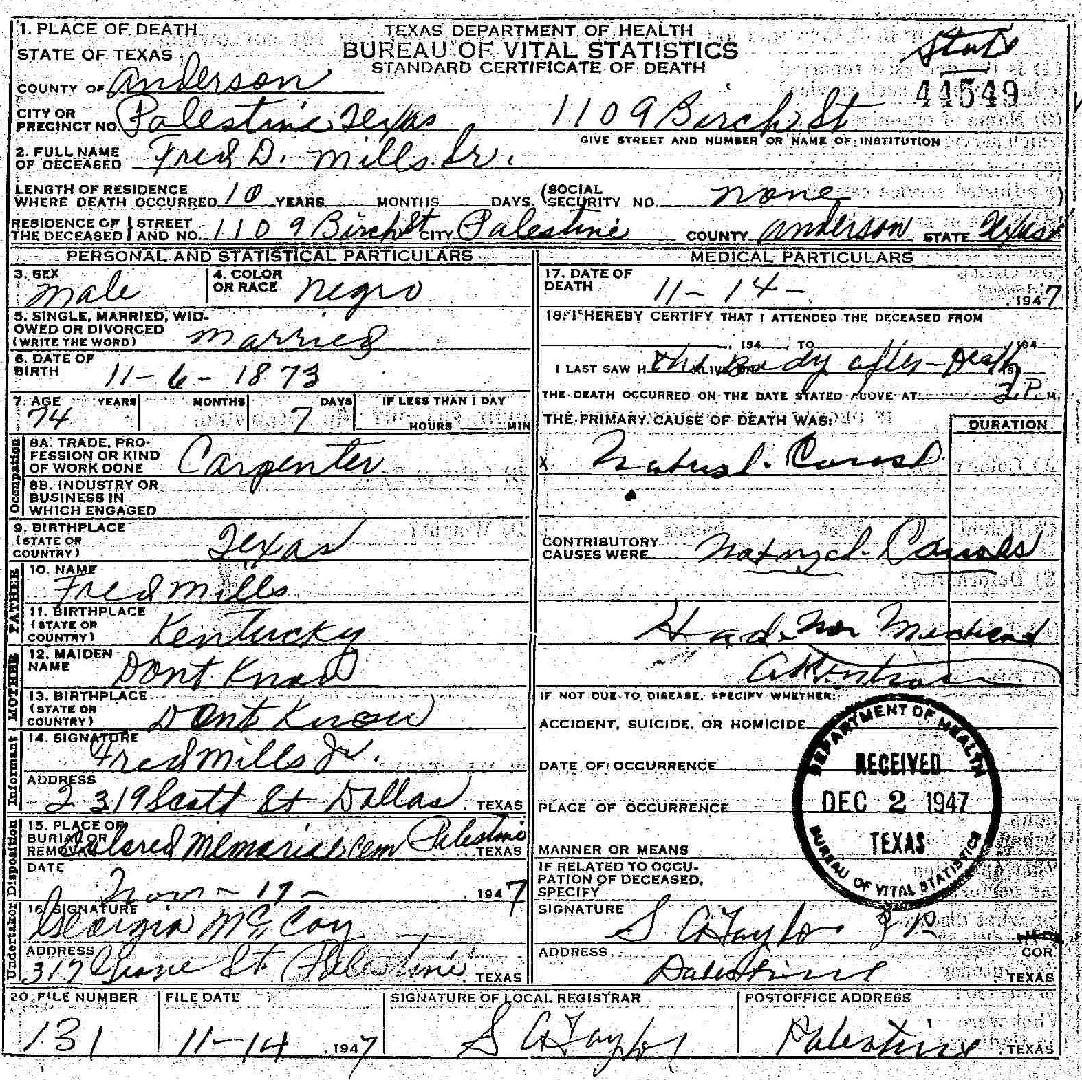 Died:  14 November 1947 - Palestine, Anderson, Texas