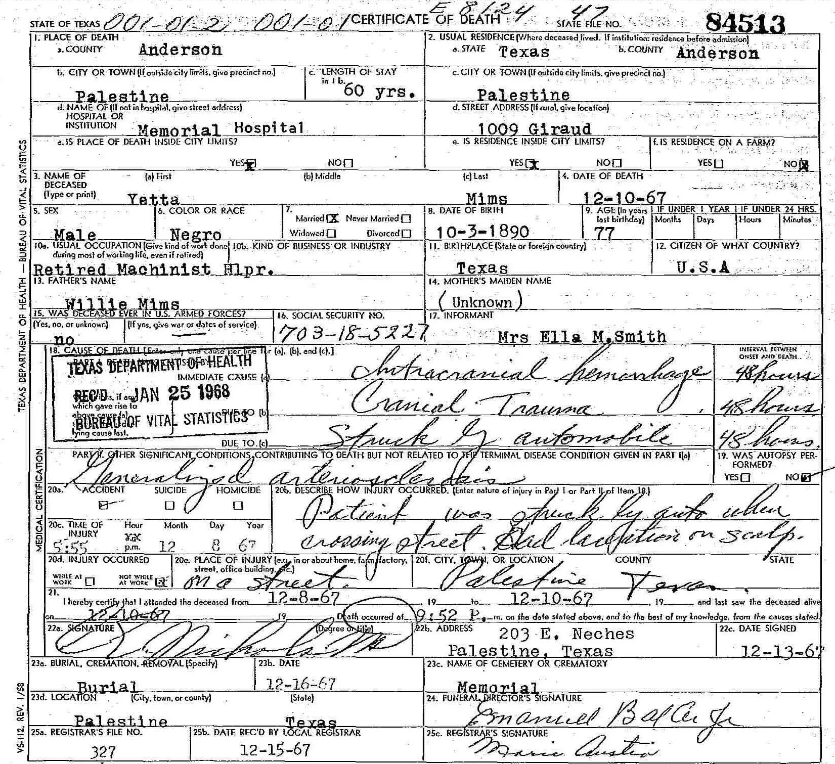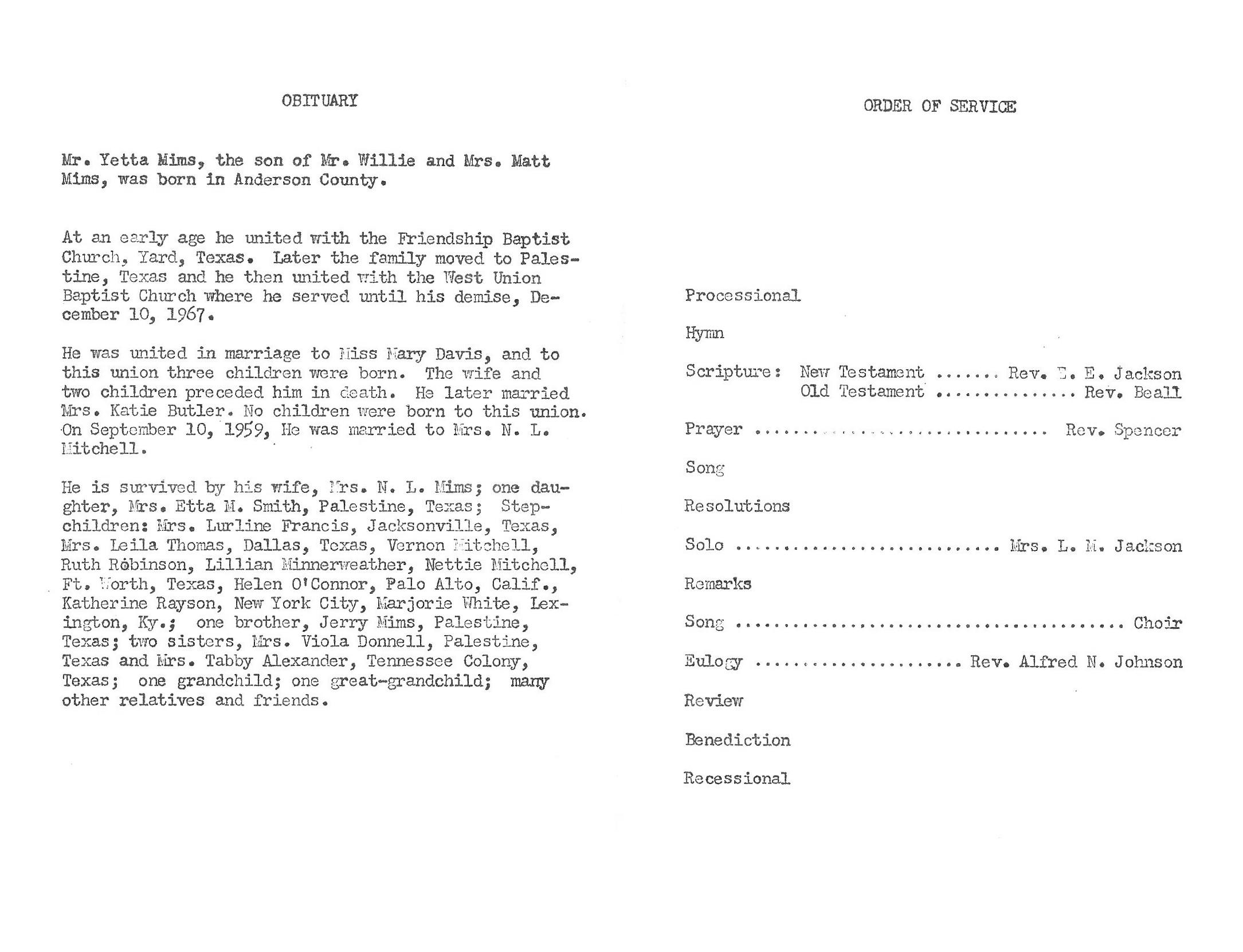 in Anderson County. At an early age he united with the Friendship Baptist Church, Yard, Texas. after the family moved to Palestine, Texas and he then united with the West Union Baptist Church where he served until his demise, December 10, 1967. He was united in marriage to Miss. Mary Davis, and to this union three children were born. The wife and two children preceded him in death. He later married Mrs. Katie Butler. No children were born to this union. On September 10, 1959, he was married to Mrs. N.L. Mitchell. He is survived by his wife, Mrs. N.L. Mims; one daughter, Mrs. Etta M. Smith, Palestine, Texas; Stepchildren: Mrs. Lurline Francis, Jacksonville, Texas, Mrs. Leila Thomas, Dallas, Texas, Vernon Mitchell, Ruth Robinson, Lillian Minnerweather, Nettie Mitchell, Ft. Worth, Texas, Helen O'Connor, Palo Alto, Calif., Katherine Rayson, New York City, Marjorie White, Lexington, Ky.; one brother, Jerry Mims, Palestine, Texas; two sisters, Mrs. Viola Donnell, Palestine, Texas and Mrs. Tabby Alexander, Tennessee Colony, Texas; one grandchild; one great-grandchild; many other relatives and friends. |