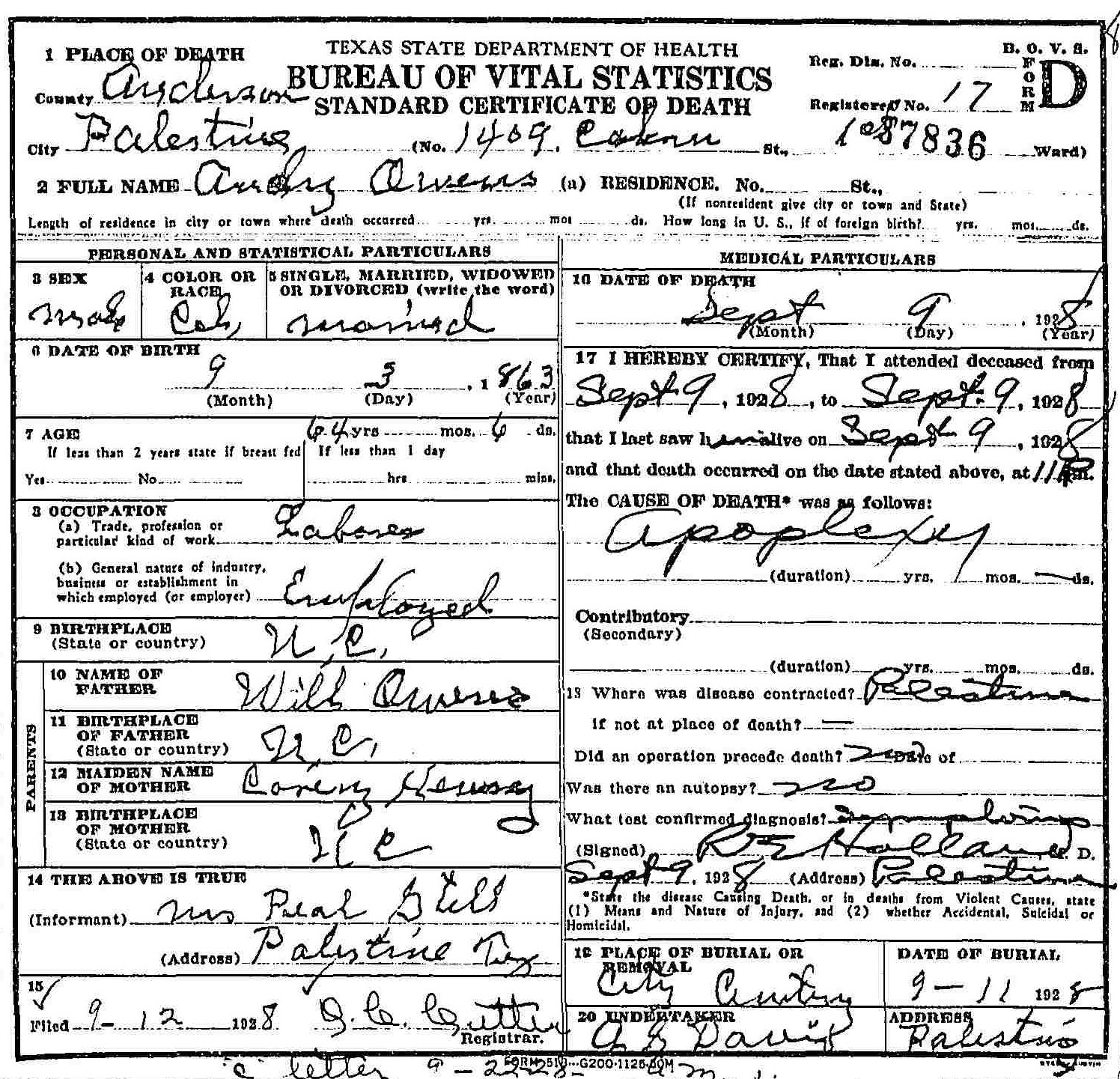 Died:  8 September 1928 - Palestine, Anderson, Texas