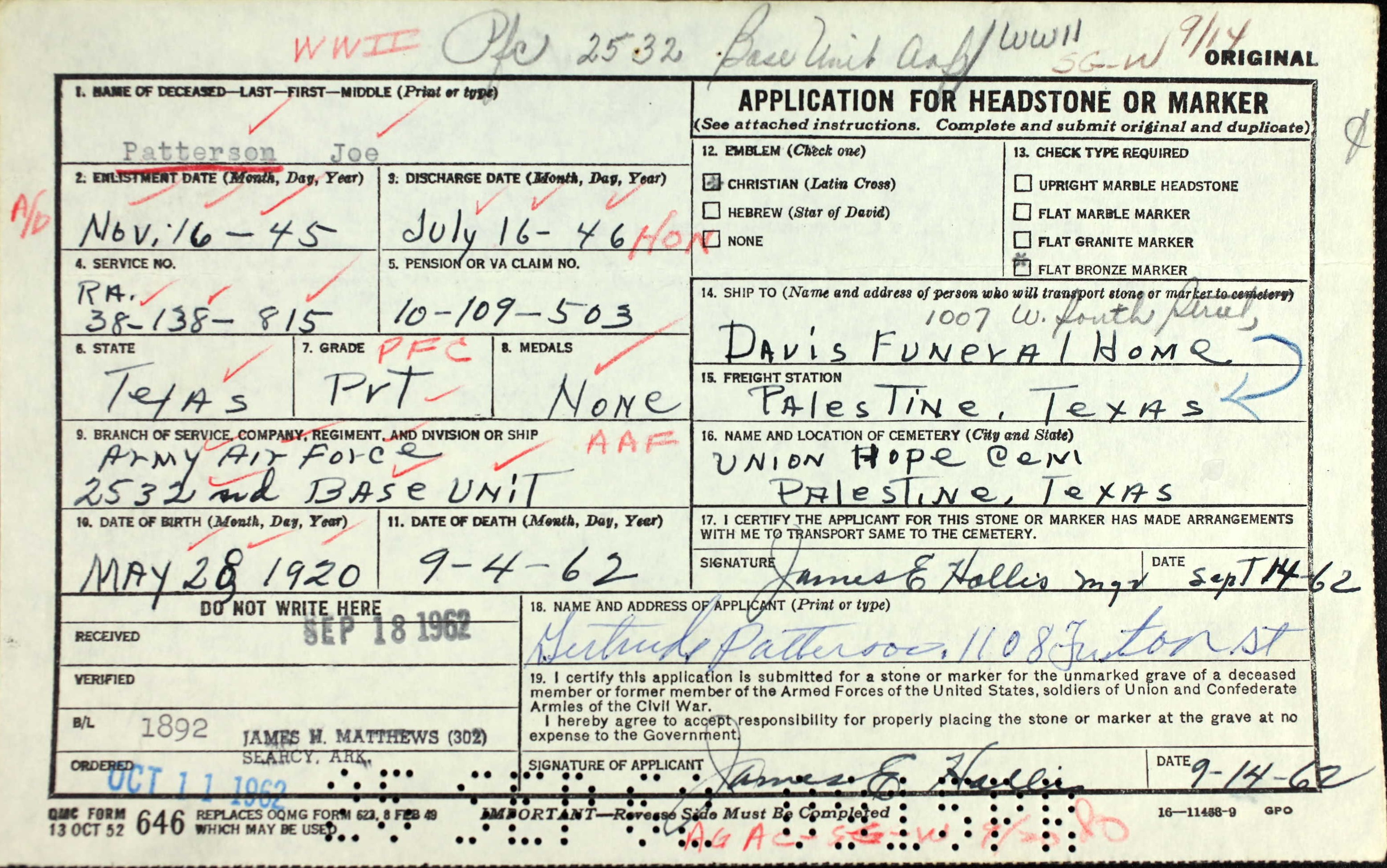 Born:  28 May 1920 - Palestine, Anderson, Texas