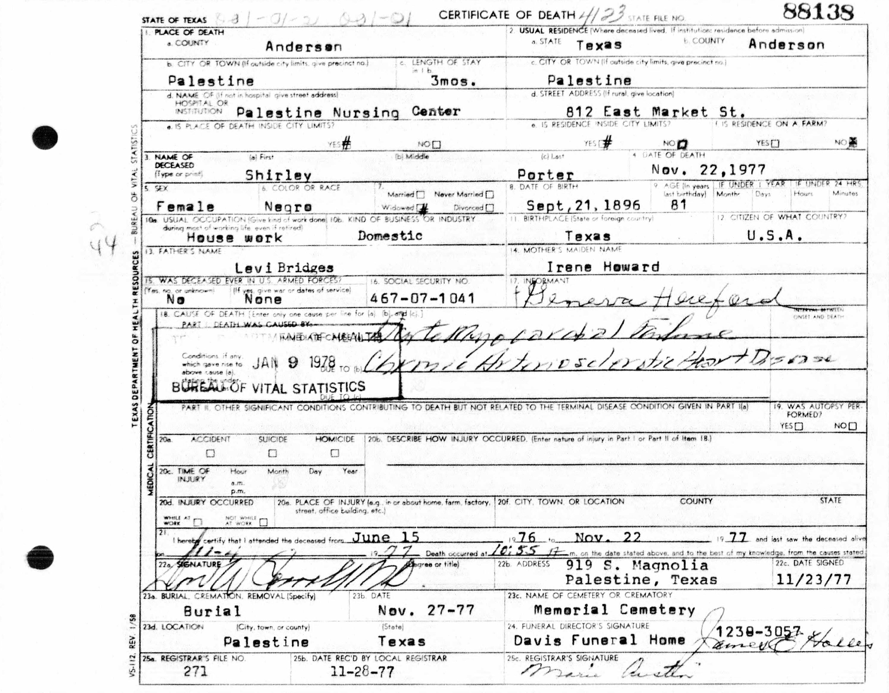 Died:  22 November 1977 - Palestine, Anderson, Texas