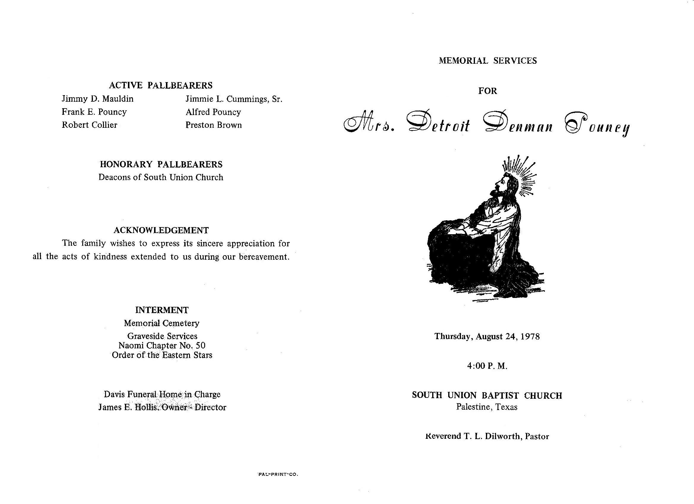 Survivors include:  a husband, Mr. Dee Pouncy of Palestine; three sons, Riley D. Pouncy, Houston, Texas, Rayford B. Pouncy, Denver, Colorado, Mitchell L. Pouncy, Baton Rouge, Louisiana; two daughters, Mrs. Alex (Veneta) Reeves, Los Angeles, California, Ms. Georgia L. Pouncy, Palestine; two brothers, Mr. T. Royal Denman and Mr. Valor D. Denman, both of Kennard, Texas; one sister, Mrs. McClellan (Effrage) Tennard, Palestine; six grandchildren, three great grandchildren, many nieces, nephews, cousins and a multitude of friends.