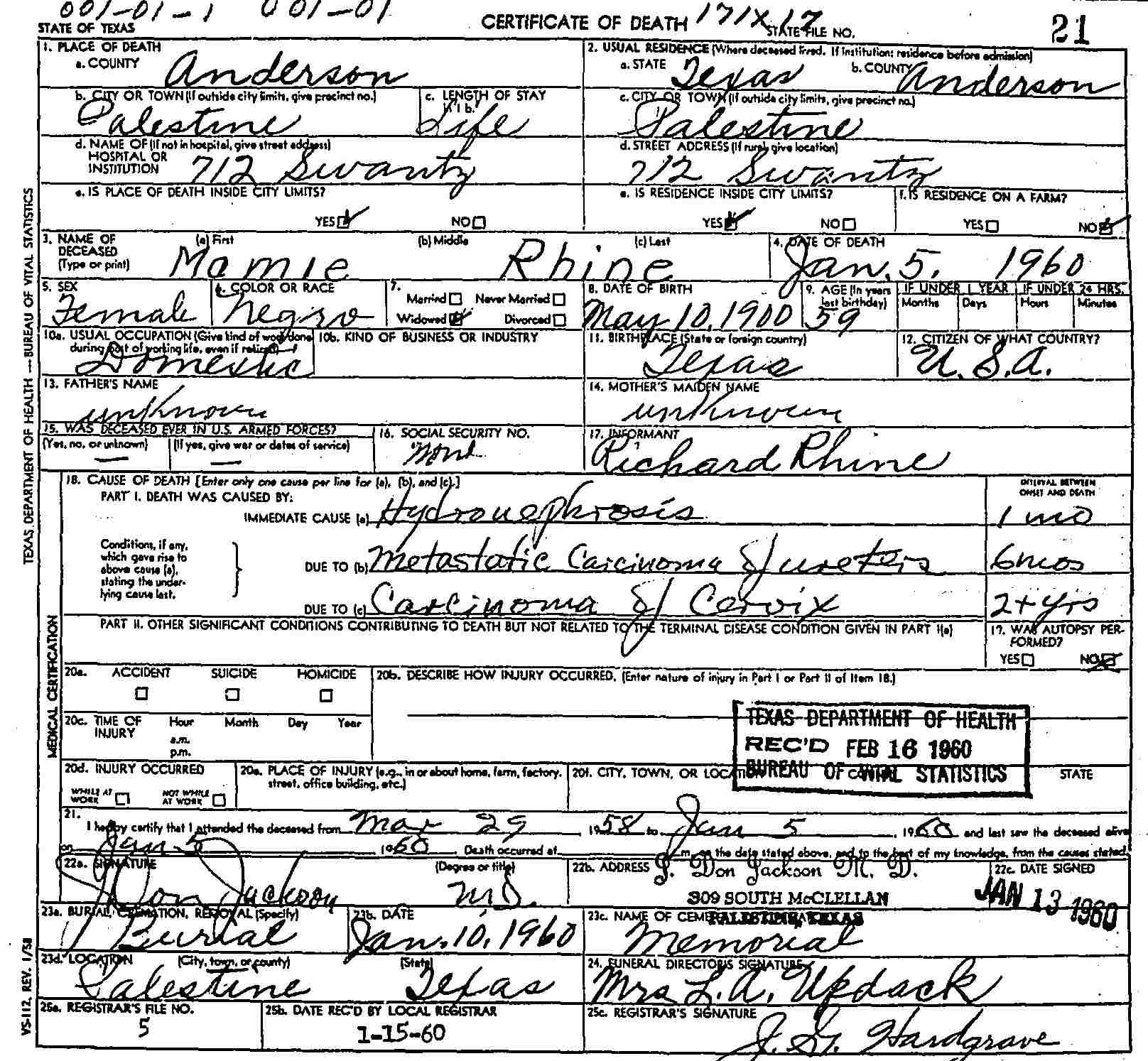 Name:Mamie Rines Age:40 Estimated birth year:abt 1900 Gender:Female Race:Negro (Black) Birthplace:Texas Marital Status:Married Relation to Head of House:Head Home in 1940:Palestine, Anderson, Texas Street:SouthHouse Number:706 Farm:NoInferred Residence in 1935:Palestine, Anderson, TexasResidence in 1935: Same Place Sheet Number:5B Number of Household in Order of Visitation:111 Occupation :Cook