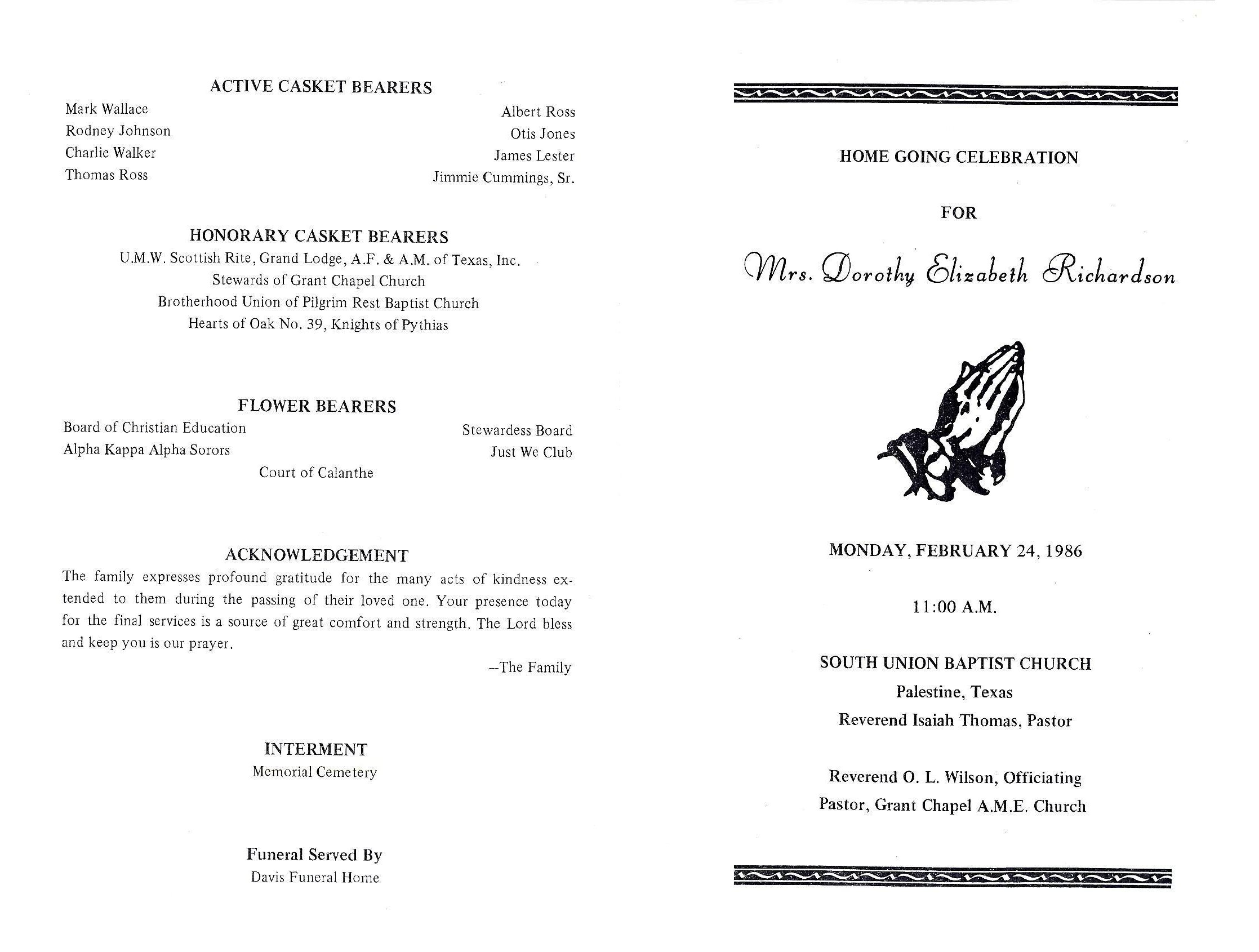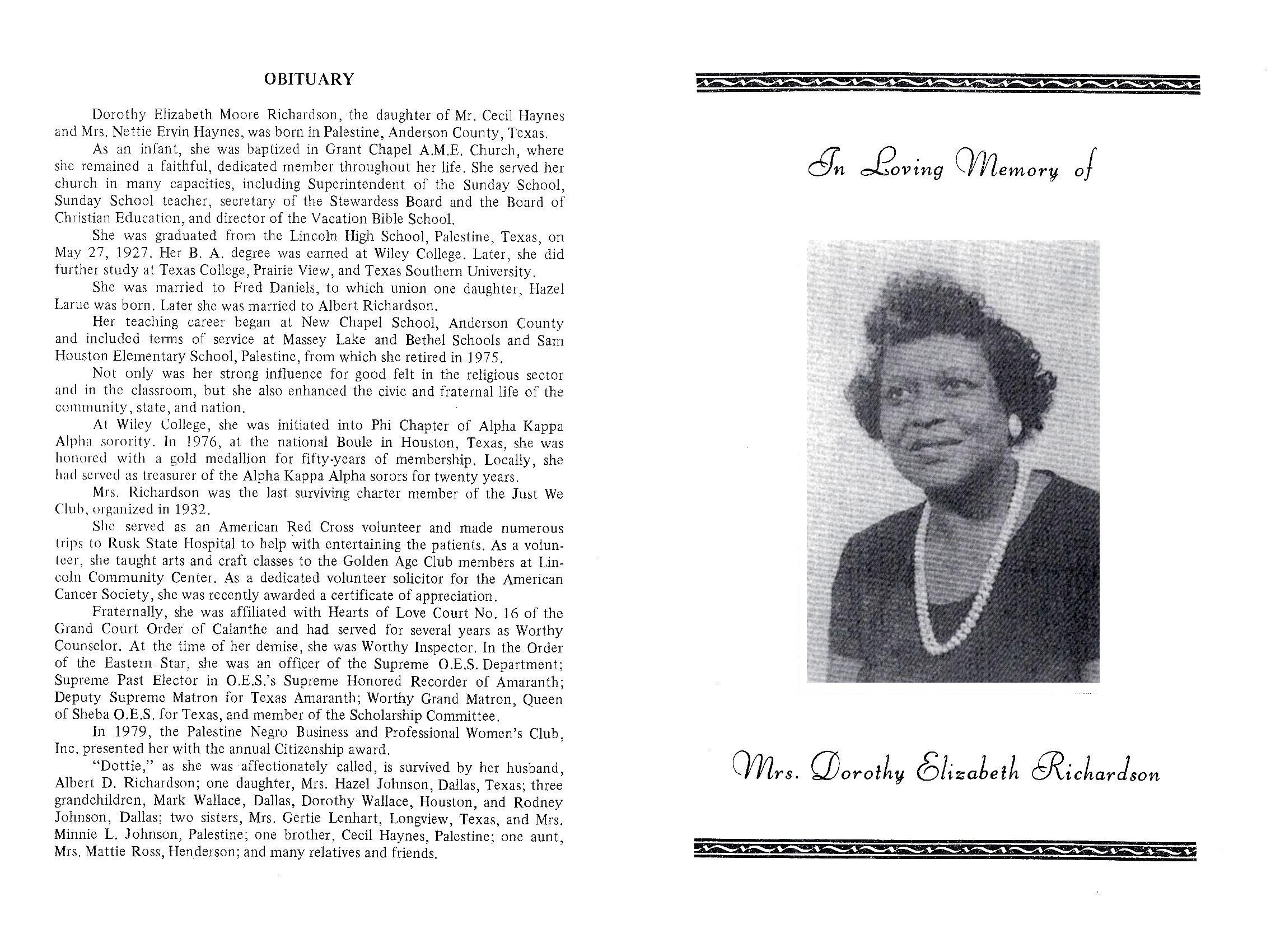 in Palestine, Anderson County, Texas. As an infant, she was baptized in Grant Chapel A.M.E. Church, where she remained a faithful, dedicated member throughout her life. She served her church in many capacities, including Superintendent of the Sunday School, Sunday school teacher, secretary of the Stewardess Board and the Board of Christian Education, and director of the Vacation Bible School. She was graduated from the Lincoln High School, Palestine, Texas, on May 27, 1927. her B.A. degree was earned at Wiley College. Later, she did further study at Texas College, Prairie View, and Texas Southern University. She was married to Fred Daniels, to which union one daughter, Hazel Larue was born. Later she married to Albert Richardson. Her teaching career began at New Chapel School, Anderson County and included terms of service at Massey Lake and Bethel Schools and Sam Houston Elementary School, Palestine, from which she retired in 1975. Not only was her strong influence for good felt in the religious sector and in the classroom, but she also enhanced the civic and fraternal life of the community, state and nation. At Wiley College, she was initiated into Phi Chapter of Alpha Kappa Alpha sorority. In 1976, at the national Boule in Houston, Texas, she was honored with a gold medallion for fifty-five years of membership. Locally, she had served as treasurer of the Alpha Kappa Alpha sorors for twenty years. Mrs. Richardson was the last surviving charter member of the Just We Club, organized in 1932. She served as an American Red Cross volunteer and made numerous trips to Rusk State Hospital to help with entertaining the patients. As a volunteer, she taught arts and craft classes to the Golden Age Club members at Lincoln Community Center. As a dedicated volunteer solicitor for the American Cancer Society, she was recently awarded a certificate of appreciation. Fraternally, she was affiliated with Hearts of Love Court No. 16 of the Grand Court Order of Calanthe and had served for several years as Worthy Counselor. At the time of her demise, she was Worthy Inspector. In the Order of the Eastern Star, she was an officer of the Supreme O.E.S. Department; Supreme Past Elector in O.E.S.'s Supreme Honored Recorded of Amaranth; Deputy Supreme Matron for Texas Amaranth; Worthy Grand Matron, Queen of Sheba O.E.S. for Texas and member of the Scholarship Committee. In 1979, the Palestine Negro Business and Professional Women's Club, Inc. presented her with an annual Citizenship award. "Dottie", as she was affectionately called, is survived by her husband, albert D. Richardson; one daughter, Mrs. Hazel Johnson, Dallas, Texas; three grandchildren, Mark Wallace, Dallas, Dorothy Wallace, Houston, and Rodney Johnson, Dallas; two sisters, Mrs. Gertie Lenhart, Longview, Texas, and Mrs. Minnie L. Johnson, Palestine; one brother, Cecil Haynes, Palestine; one aunt, Mrs. Mattie Ross, Henderson; and many relatives and friends. |