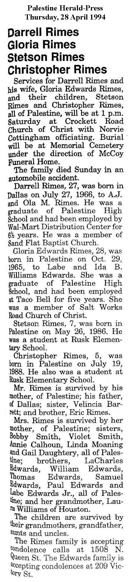 Services for Darrell Rimes and his wife, Gloria Edwards Rimes, and their children, Stetson Rimes and Christopher Rimes, all of Palestine, will be at 1 p.m. Saturday at Crockett Road Church of Christ with Norvie Cottingham officiating.  Burial will be at Memorial Cemetery under the direction of McCoy Funeral Home.