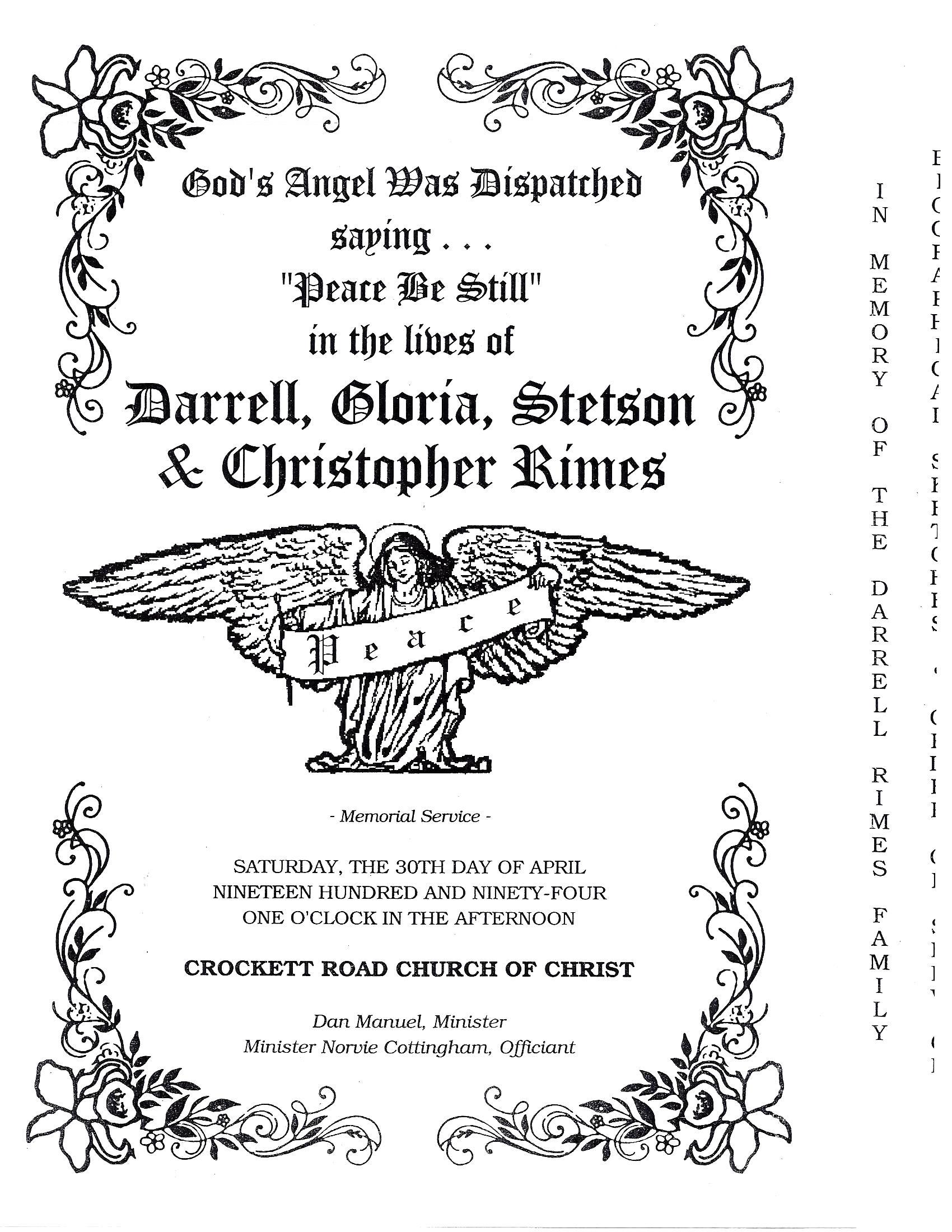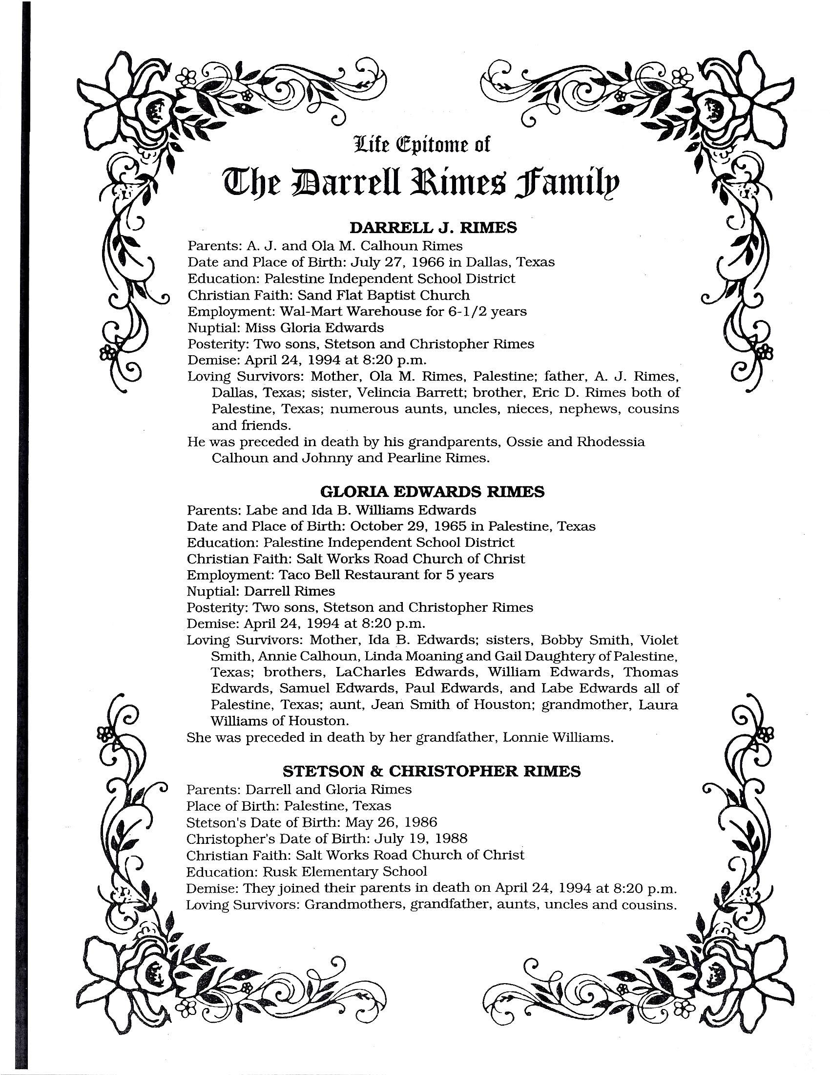 Funeral Home. The family died Sunday in an automobile accident, Darrell Rimes, 27 was born in Dallas on July 27, 1966, to A.J. and Ola M. Rimes. He was a graduate of Palestine High School and had been employed by Wal-Mart Distribution Center for 6 1/2 years. He was a member of Sand Flat Baptist Church. Gloria Edwards Rimes, 28, was born in Palestine on Oct. 29, 1965, to Labe and Ida B. Williams Edwards. She was a graduate of Palestine High School, and had been employed at Taco Bell for five years. She was a member of Salt Works Road Church of Christ. Stetson Rimes, 7, was born in Palestine on May 26, 1986. He was a student at Rusk Elementary School. Christopher Rimes, 5, was born in Palestine on July 19, 1988. He also was a student at Rusk Elementary School. Mr. Rimes is survived by his mother, of Palestine; his father, of Dallas; sister, Velincia Barrett; and brother, Eric Rimes. Mrs. Rimes is survived by her mother, of Palestine; sisters, Bobby Smith, Violet Smith, Annie Calhoun, Linda Moaning and Gail Daughtery, all of Palestine; brothers, LaCharles Edwards, William Edwards, Thomas Edwards, Samuel Edwards, Paul Edwards and Labe Edwards Jr., all of Palestine; and her grandmother Laura Williams of Houston. The children are survived by their grandmothers, grandfather, aunts and uncles. The Rimes family is accepting condolence calls at 1508 N. Queen St. The Edwards family is accepting condolences at 209 Victory St. |