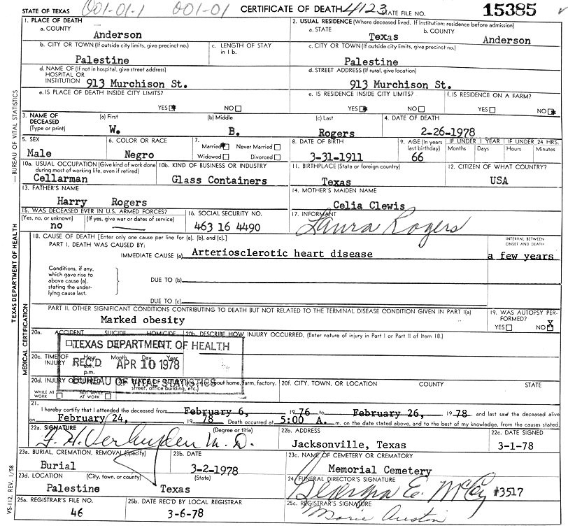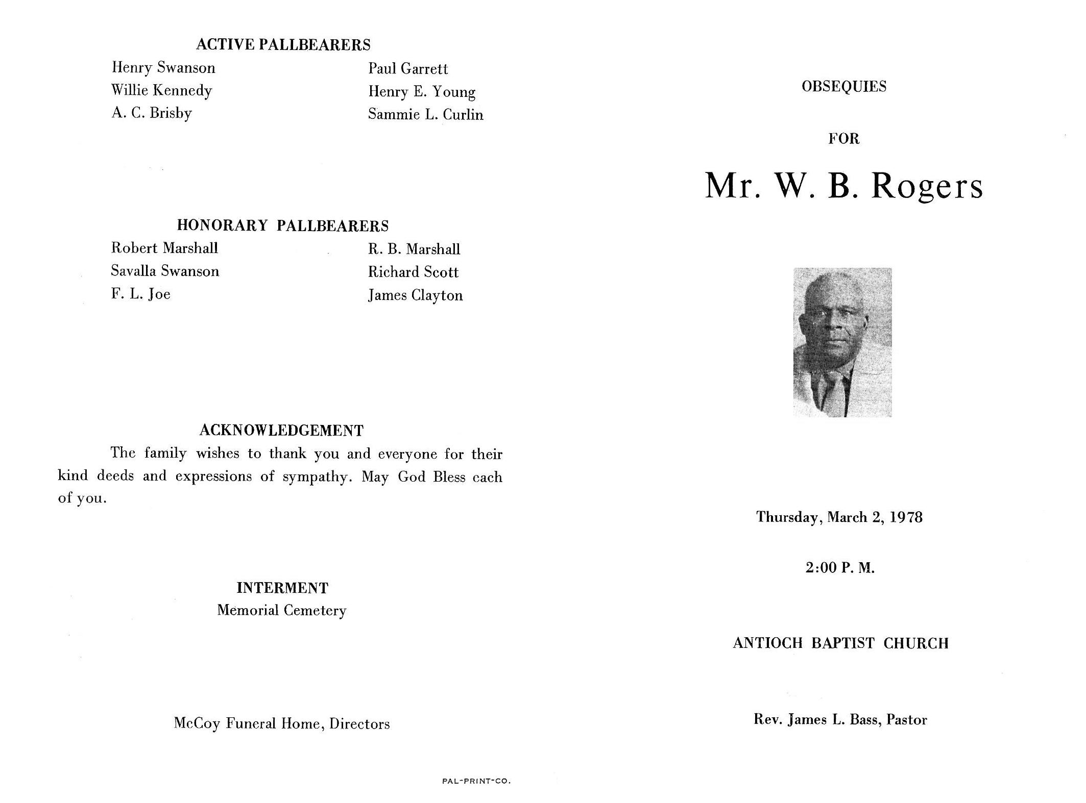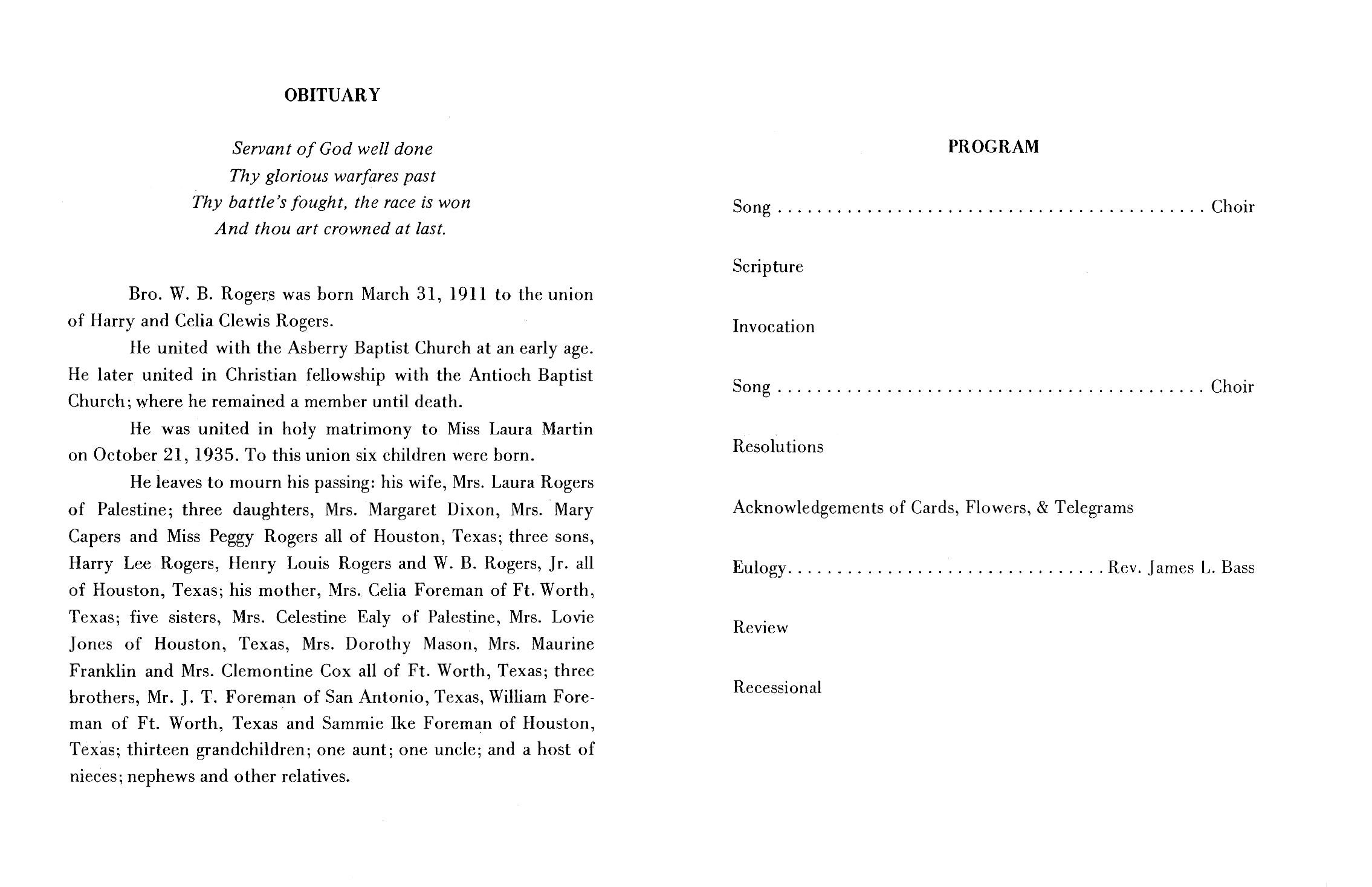 to the union of Harry and Celia Clewis Rogers. He united with the Asberry Baptist Church at an early age. He later united in Christian fellowship with the Antioch Baptist Church; where he remained a member until his death. He was united in holy matrimony to Miss Laura Martin on October 21, 1935. To this union six children were born. He leaves to mourn his passing: his wife, Mrs. Laura Rogers of Palestine; three daughters, Mrs. Margaret Dixon, Mrs. Mary Capers and Miss Peggy Rogers all of Houston, Texas; three sons, Harry Lee Rogers, Henry Louis Rogers and W.B. Rogers, Jr. all of Houston, Texas; his mother, Mrs. Celia Foreman of Ft. Worth, Texas; five sisters, Mrs. Celestine Ealy of Palestine, Mrs. Lovie Jones of Houston, Texas, Mrs. Dorothy Mason, Mrs. Maurine Franklin and Mrs. Clemontine Cox all of Ft. Worth, Texas; three brothers, Mr. J.T. Foreman of San Antonio, Texas, William Foreman of Ft. Worth, Texas and Sammie Ike Foreman of Houston, Texas; thirteen grandchildren; one aunt; one uncle; and a host of nieces; nephews and other relatives. |