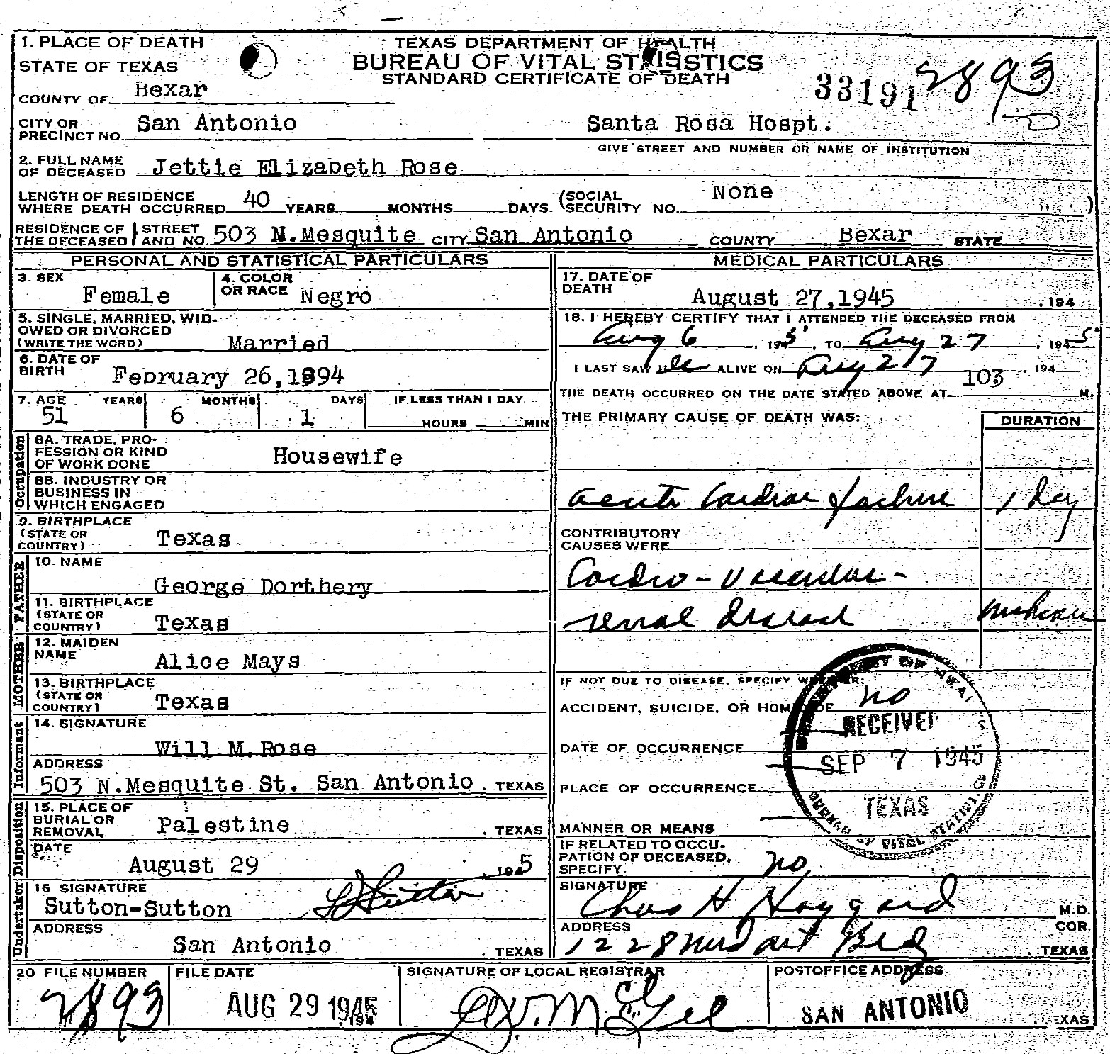 Died:  27 August 1945 - Santa Rosa Hospital - San Antonio, Bexar, Texas