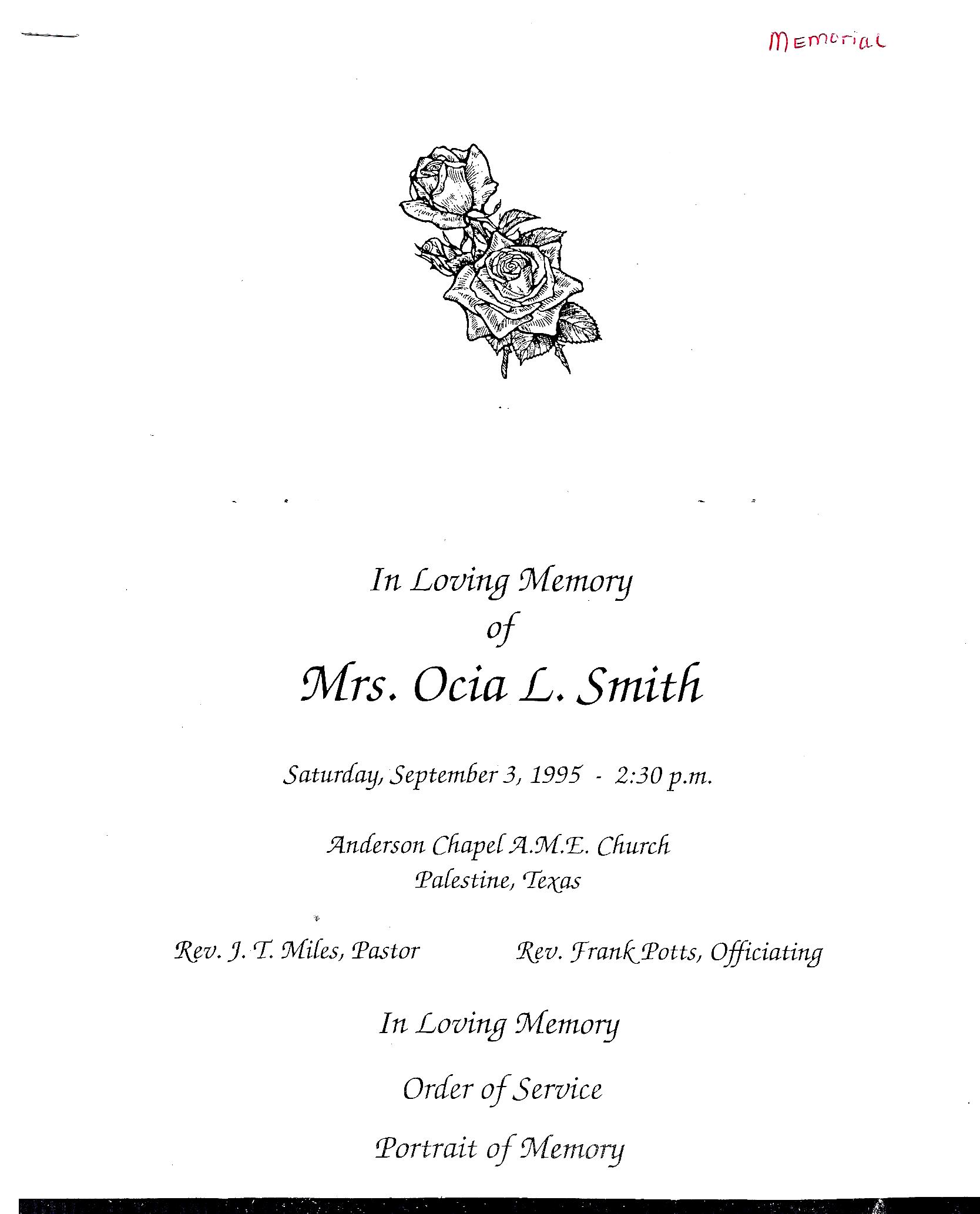 children. She attended Galilee School and worked for the Missouri Pacific Hospital. At an early age she united with the Anderson Chapel A.M.E. Church. Ocia was married to Millard Smith on November 5, 1922. To them four daughters were born. Her mother, father and husband preceded her in death. She is survived by: her children, Mary E. Hinton, Lillie Mae Holmes, Mamie Birdow and Vivian Hinton; fifteen grandchildren; forty-eight great grandchildren; fifty-one great great grandchildren; two sisters-in-law, Mrs. Estelle Muse and Roberta Smith; a special friend, Joe Butler; and a host of other relatvies and friends. Her family and friends will miss her very much. May God take her over to Glory. |