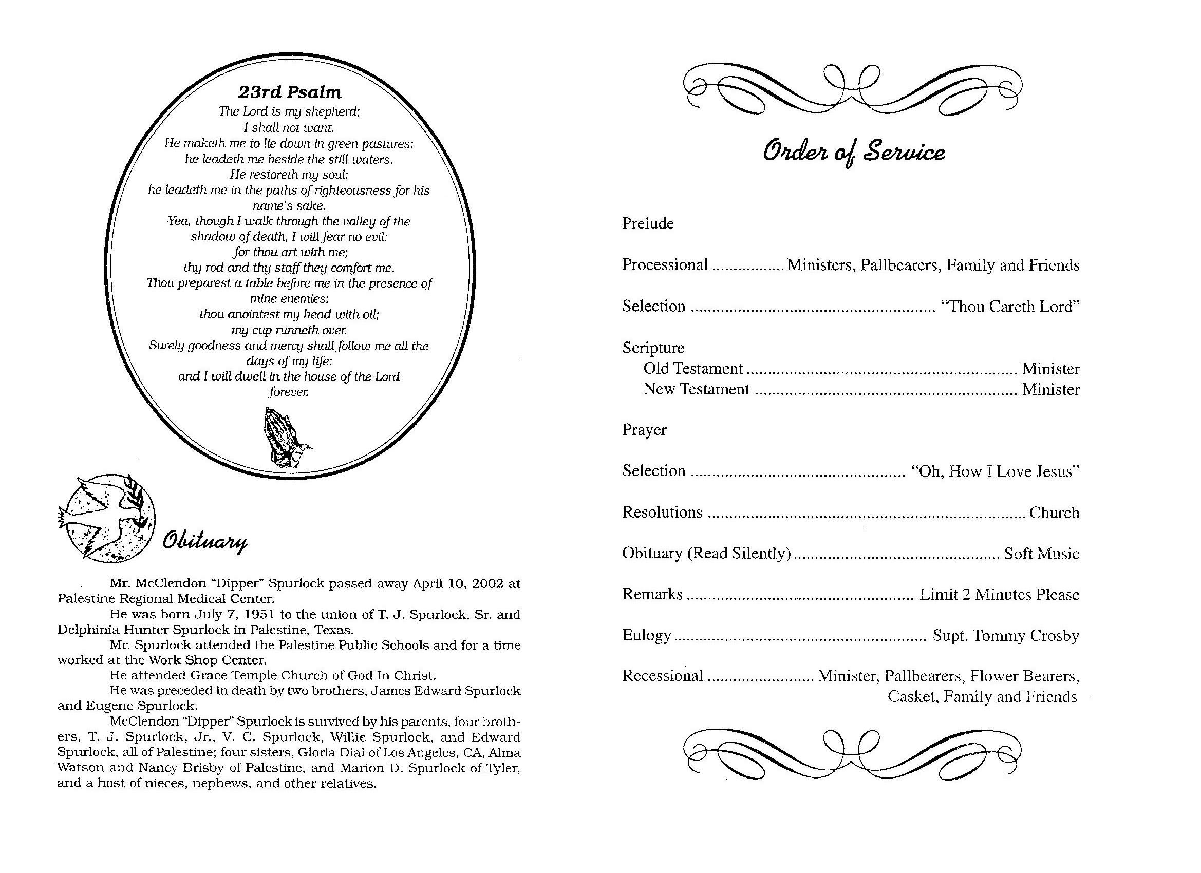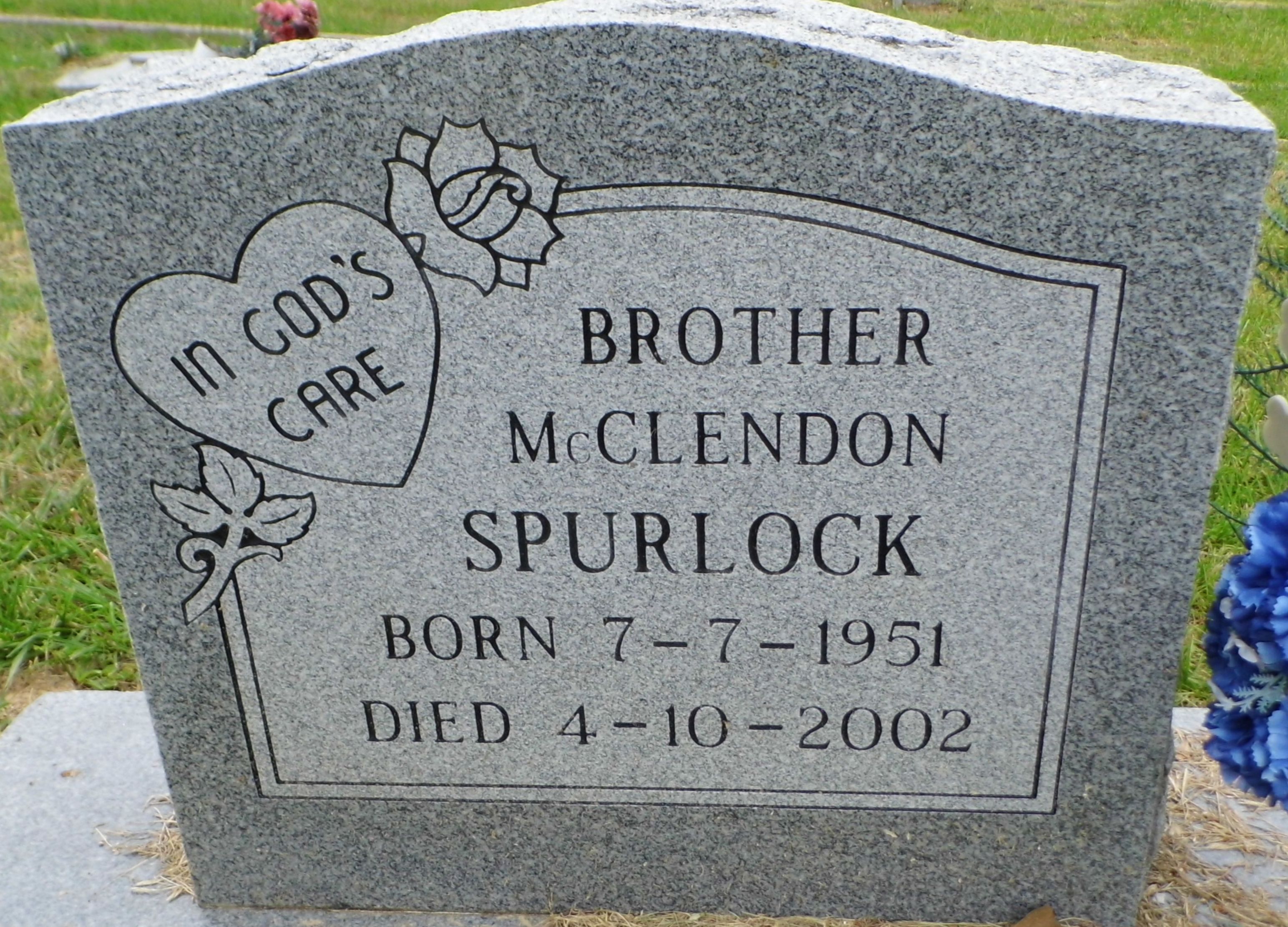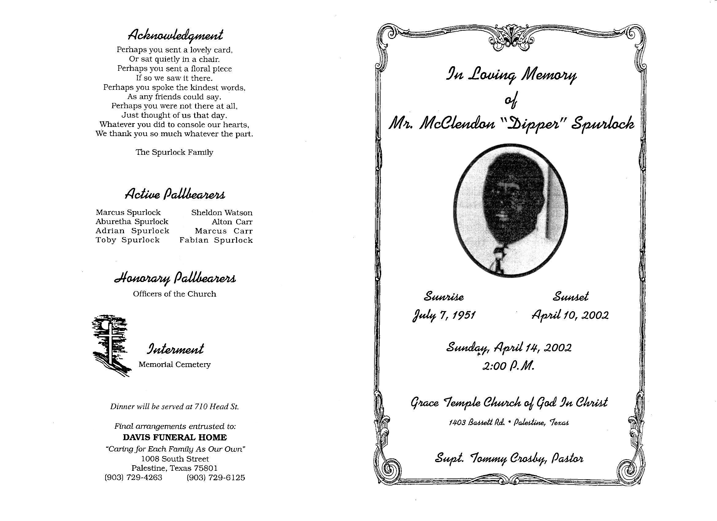Palestine Regional Medical Center. He was born July 7, 1951 to the union of T.J. Spurlock, Sr. and Delphinia Hunter Spurlock in Palestine, Texas. He attended Grace Temple Church of God in Christ. He was preceded in death by two brothers, James Edward Spurlock and Eugene Spurlock. McClendon 'Dipper' Spurlock is survived by his parents, four brothers, T.J. Spurlock Jr., V.C. Spurlock, Willie Spurlock, and Edward Spurlock, all of Palestine; four sisters, Gloria Dial of Los Angeles, CA., Alma Watson and Nancy Brisby of Palestine, and Marion D. Spurlock of Tyler, with a host of nieces, nephews, and other relatives. |