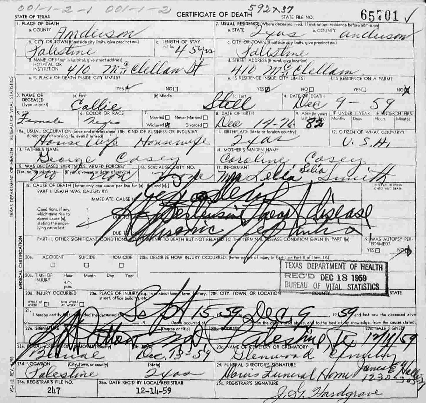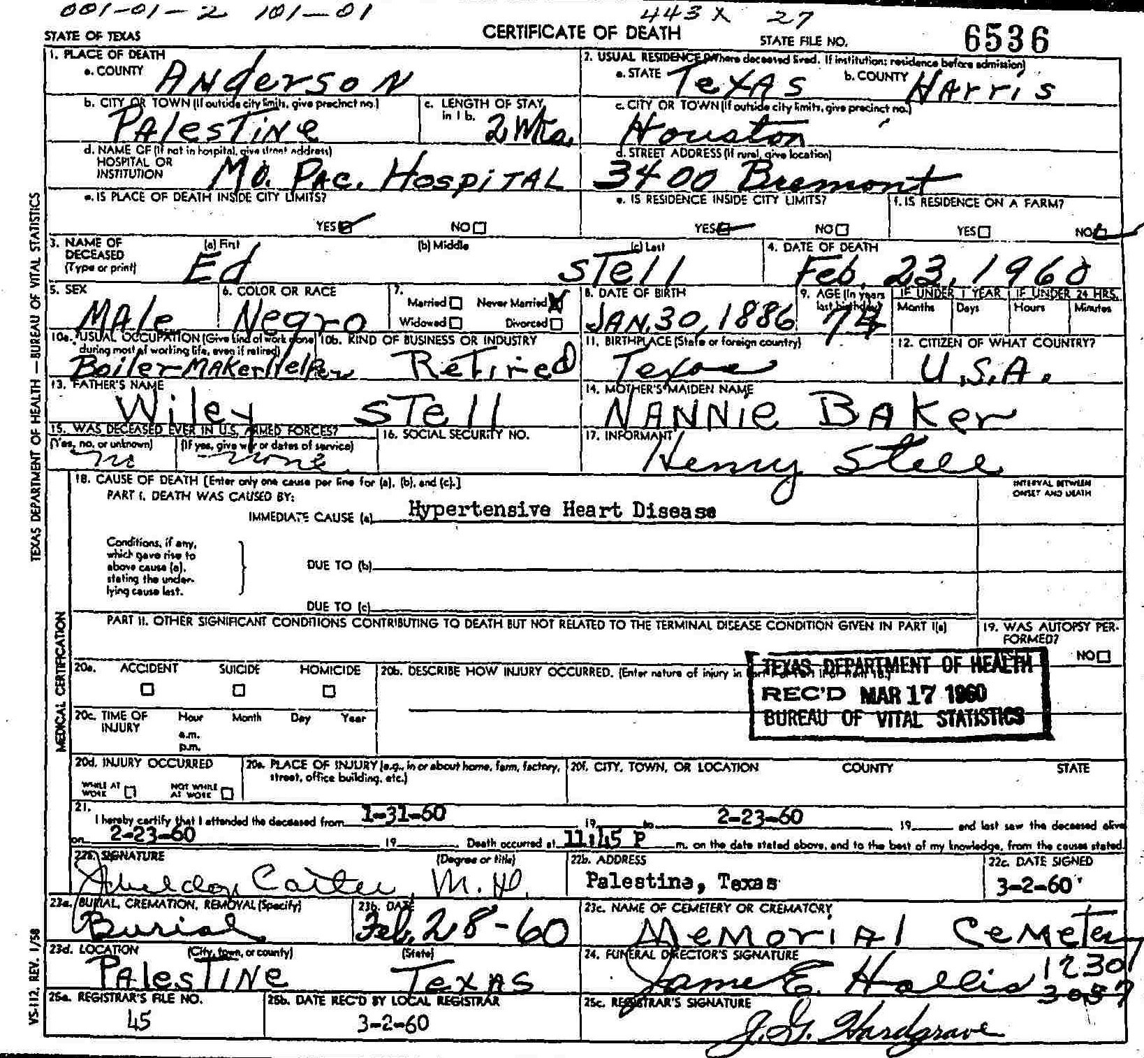 Died:  23 February 1960 - Mo Pac Hospital - Palestine, Anderson, Texas