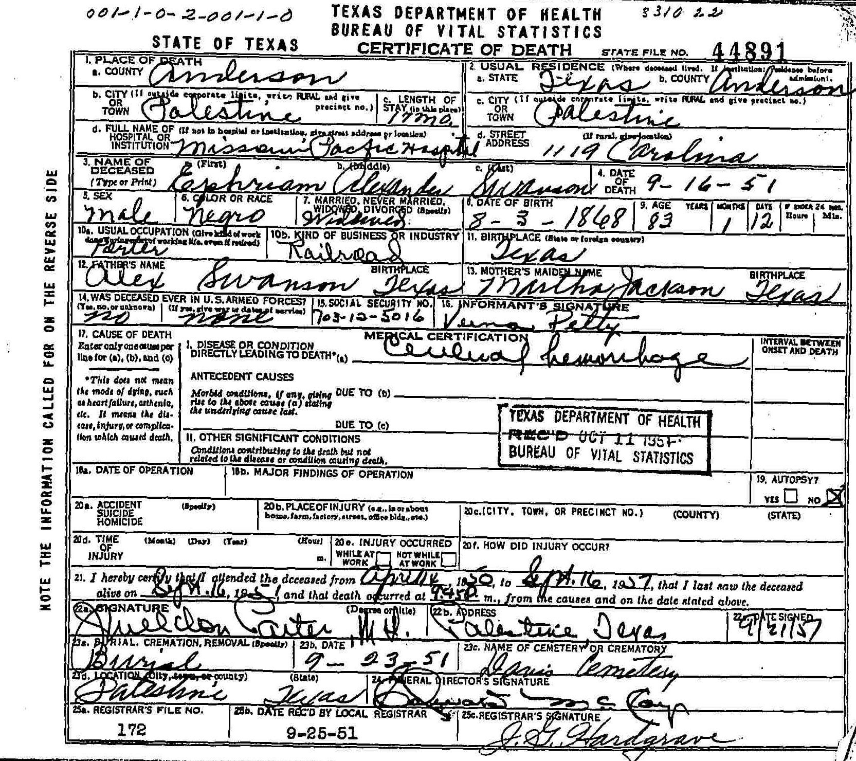 Died:  16 September 1951 - Palestine, Anderson, Texas