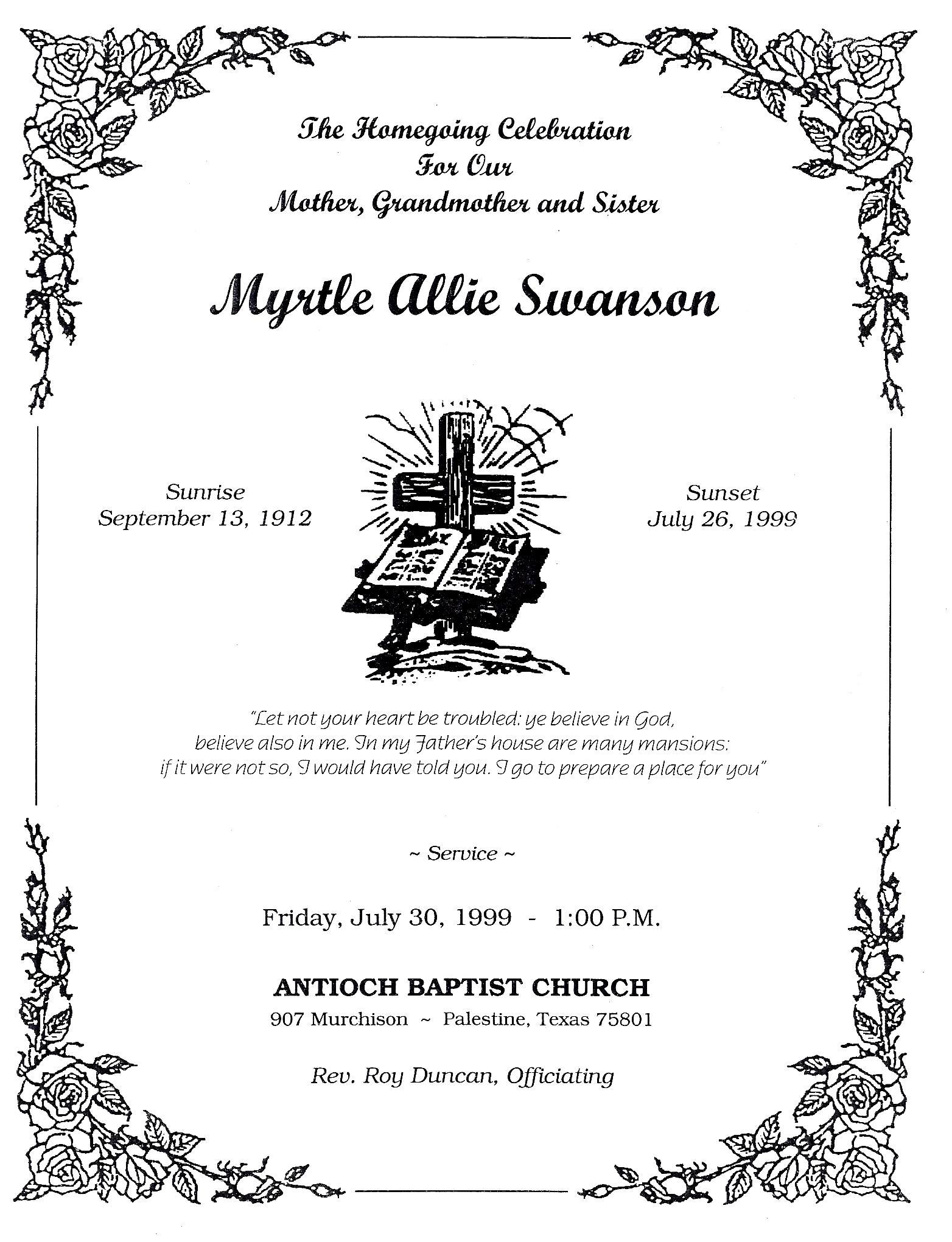 A Godly Life ended July 26, 1999 when Mrs. Myrtle Allie Swanson was taken from us.  We know she is at rest with our Heavenly Father.  After so much suffering by sister Myrtle Swanson, the Lord took from her all pain and took her to herself, where there is no pain and no burden of a tear.
