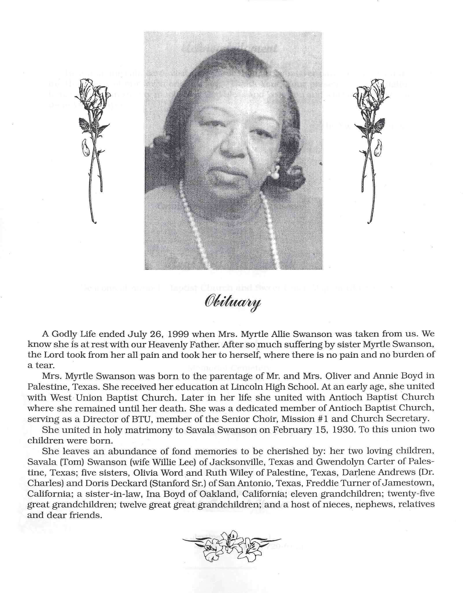 Mrs. Myrtle Swanson was born to the parentage of Mr. and Mrs. Oliver and Annie Boyd in Palestine, Texas.   She received her education at Lincoln High School. a t an early age, she united with Wet. Union Baptist Church.  Later in her life she united with Antioch Baptist Church where she remained until her death. She was a dedicated member of Antioch Baptist Church serving as a Director of BTU, member of the Senior Choir, Mission #1 and Church Secretary.