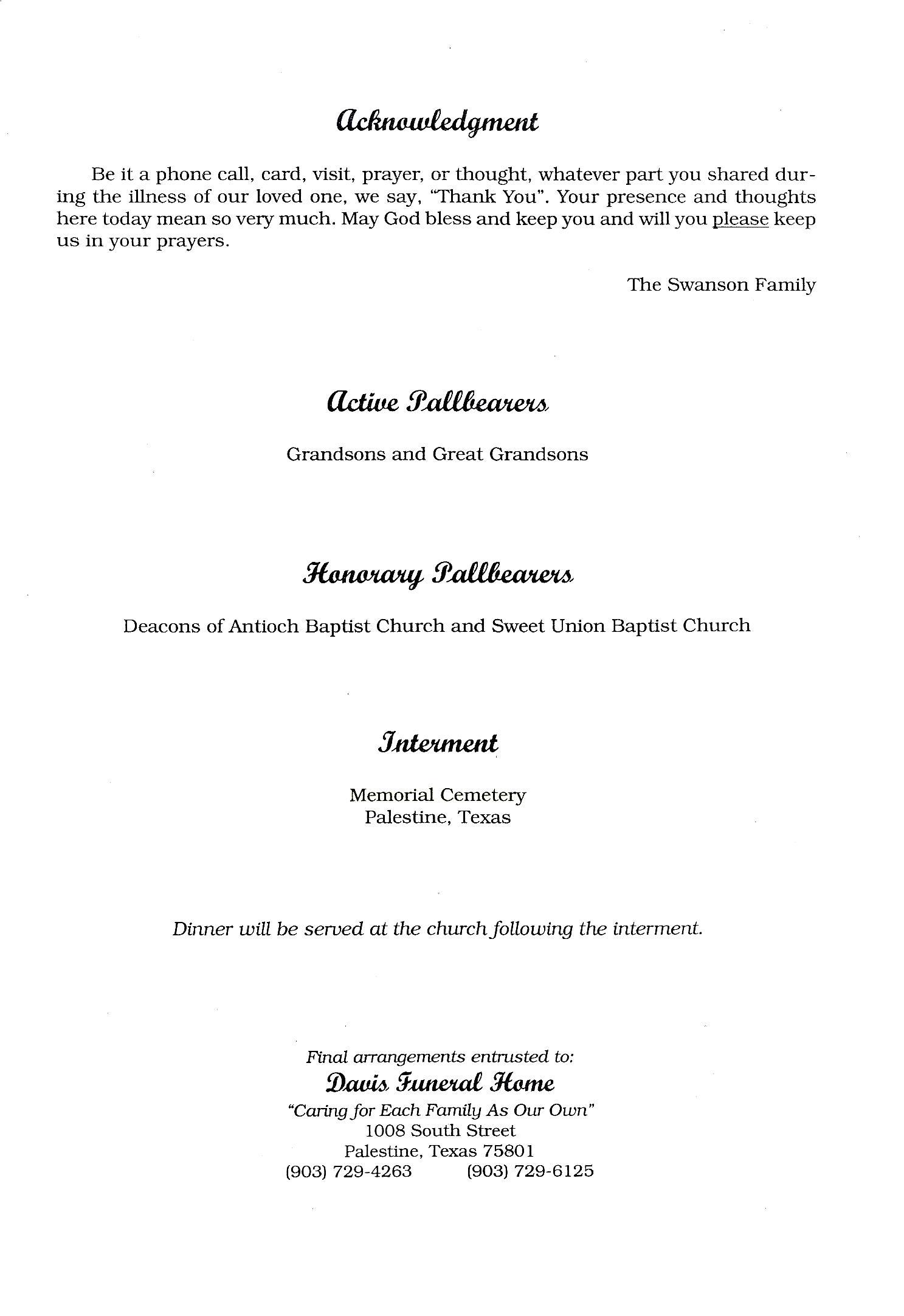 She leaves an abundance of fond memories to be cherished by:  her two loving children, Savala (Tom) Swanson (wife Willie Lee) of Jacksonville, Texas and Gwendolyn Carter of Palestine, Texas; five sisters, Olivia Word and Ruth Wiley of Palestine, Texas, Darlene Andrews (Dr. Charles) and Doris Deckard (Stanford Sr.) of San Antonio, Texas, Freddie Turner of Jamestown, California; a sister-in-law, Ina Boyd of Oakland, California; eleven grandchildren; twenty-five great grandchildren; twelve great great-grandchildren; and a host of nieces, nephews, relatives and dear friends.