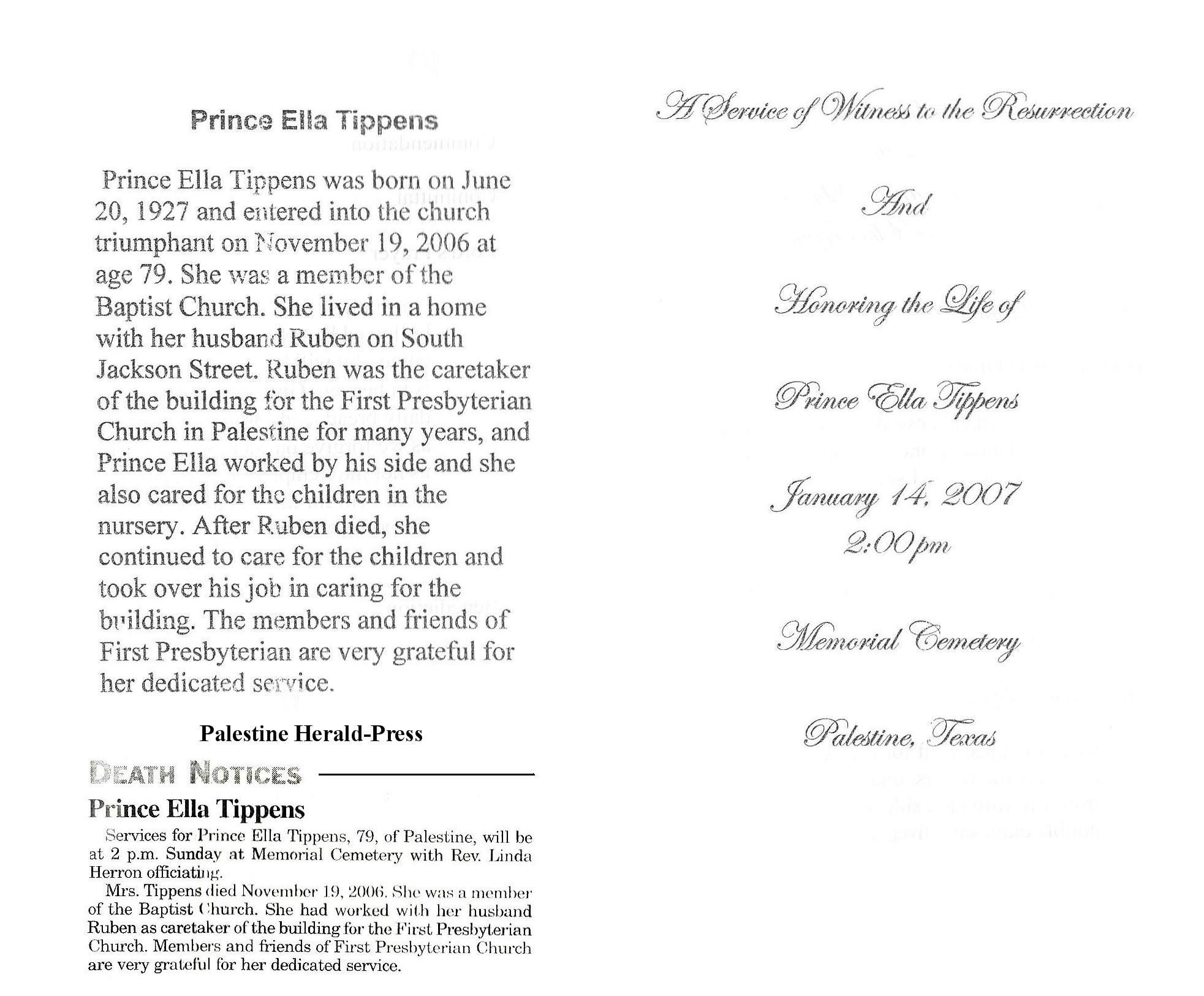 Prince Ella Tippens was born on June 20, 1927 and entered into the church triumphant on November 19, 2006 at age 70. She was a member of the Baptist Church. She lived in a home with her husband Ruben on South Jackson Street. Ruben was the caretaker of the building for the First Presbyterian Church in Palestine for many years, and Prince Ella worked by his side and she also cared for the children in the nursery. After Ruben died, she continued to care for the children and took over the job in caring for the building. The members and friends of First Presbyterian are very grateful for her dedicated service. |