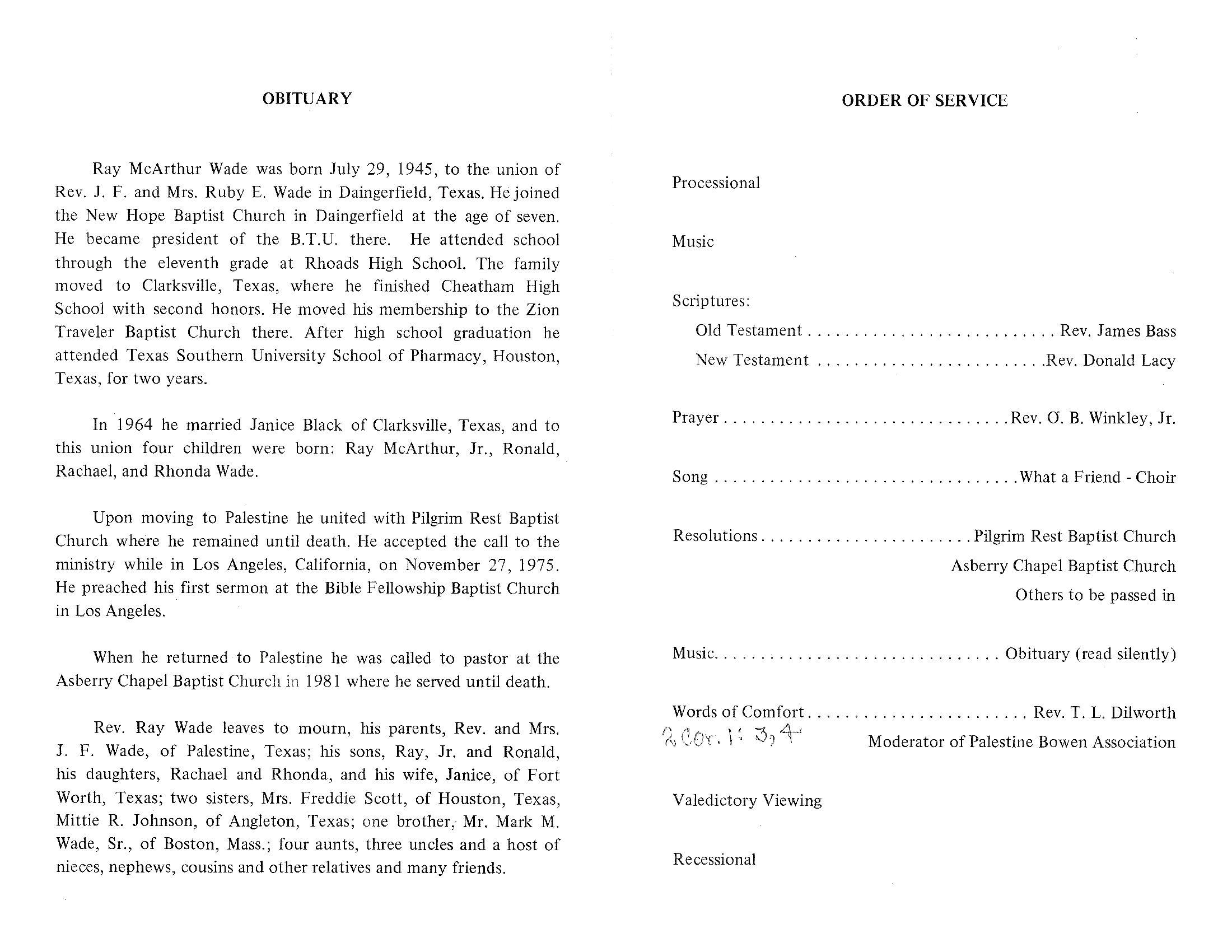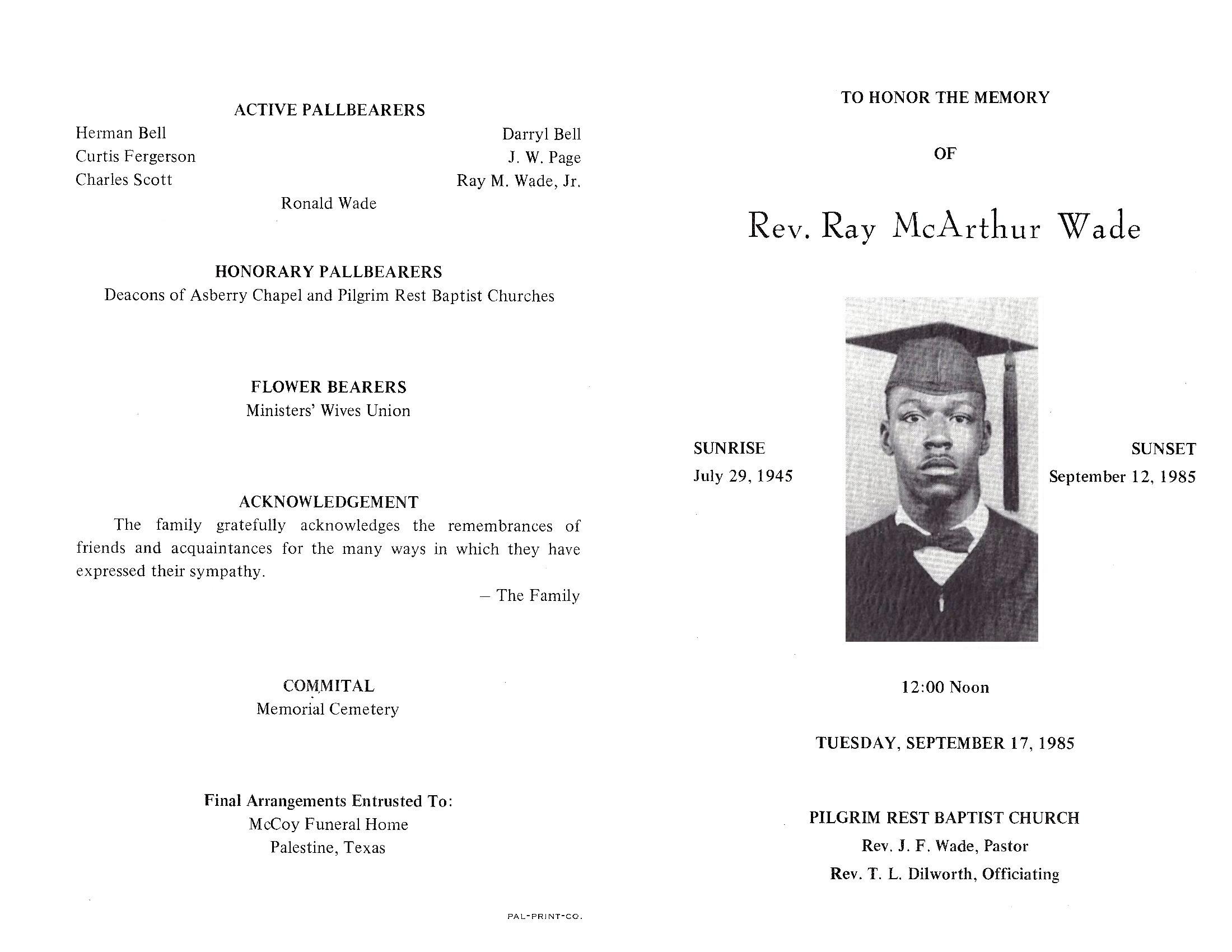 Services for the Rev. Ray McArthur Wade, 40,