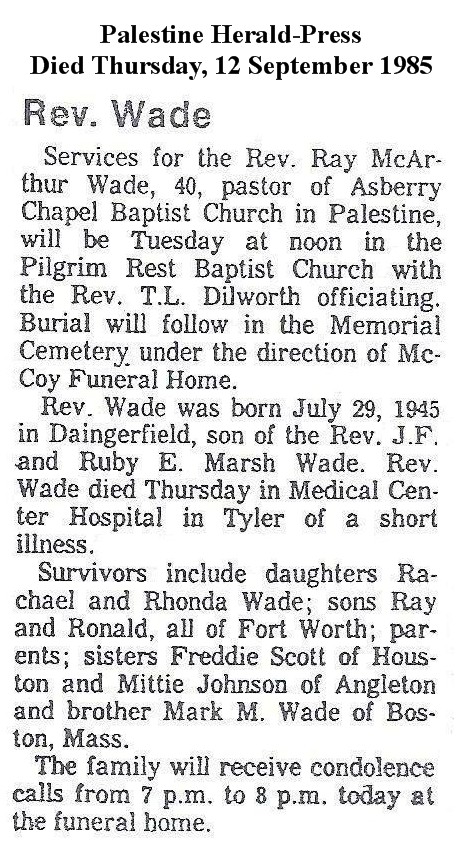 and Mrs. J.F. Wade, of Palestine, Texas; his sons, Ray, Jr. and